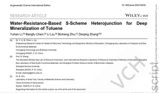 近日,我校废油资源化技术与装备教育部工程研究中心李宇涵研究员在针对油气中苯系物的高效治理方面取得了重要进展,成果“Water-Resistance-Based S-Scheme Heterojunction for Deep Mineralization of Toluene”(基于耐水性的S-方案异质结在甲苯深部矿化中的应用)以重庆工商大学为第一署名单位在化学领域学术期刊《Angewandte Chemie International Edition》上发表(https://doi.org/10.1002/anie.202319432),标志着在“双碳”背景下废油中心在废油油气污染防治方向研究进入了新阶段。