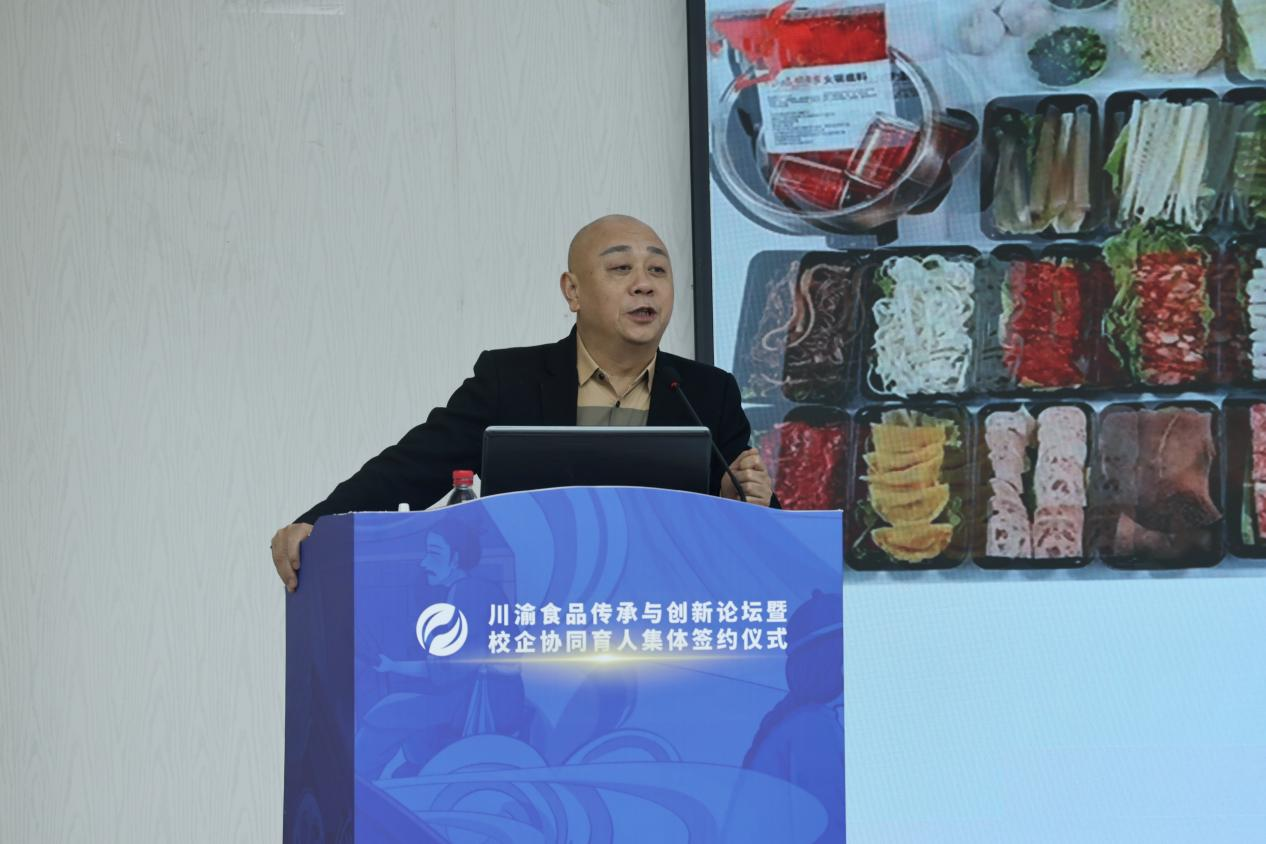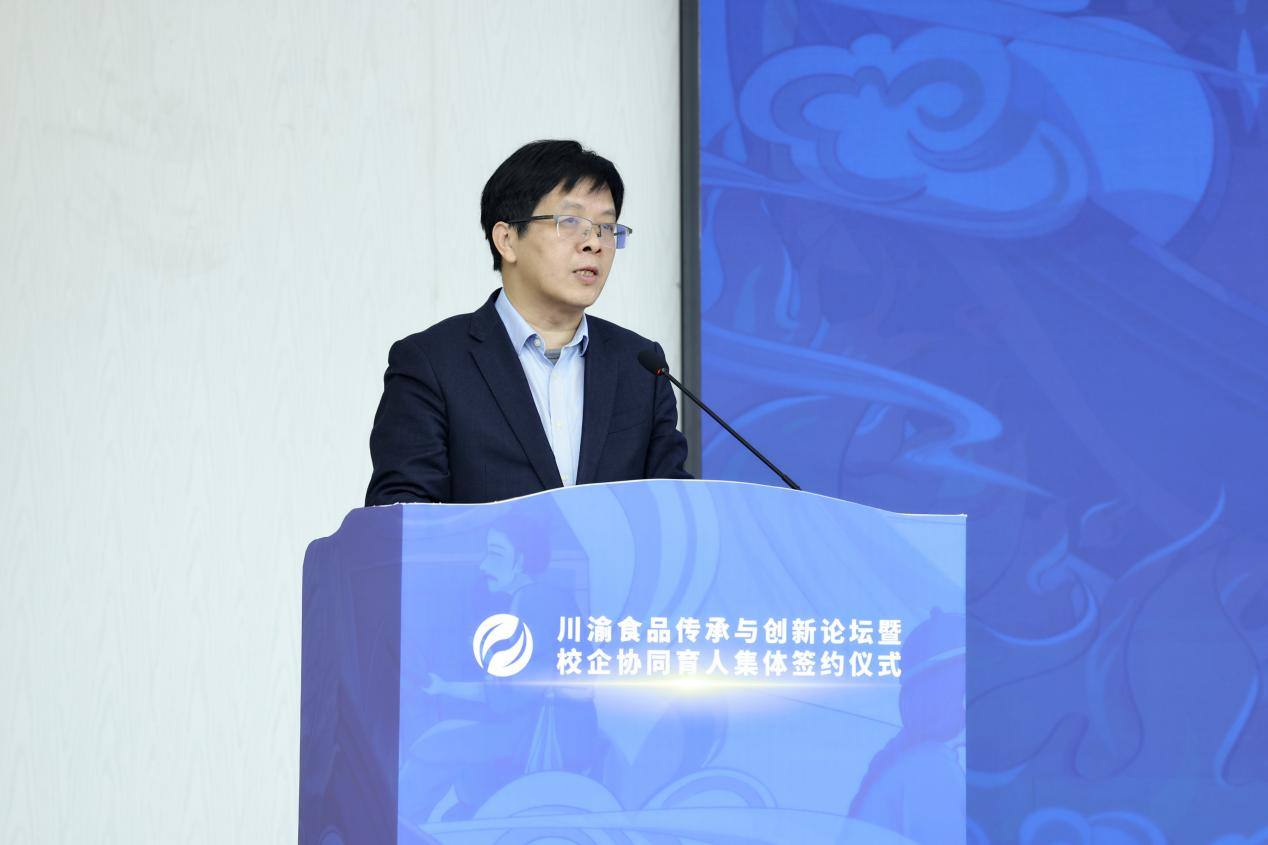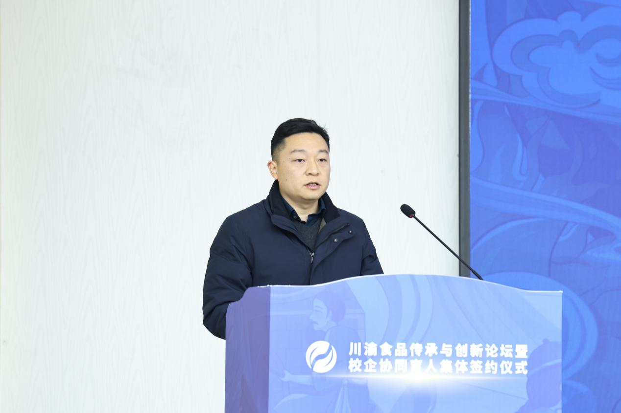 签约仪式上,曾维伦代表学校致欢迎辞。他谈到,学校致力于发挥在食品与农产品加工等领域的学科专业优势,紧贴重庆“33618”现代制造业集群体系建设要求,对标食品与农产品产业发展需求,持续发力科教融汇、产教协同,主动介入“四链”融合。学校的发展得到了食品学界、业界和上级部门的关心指导,取得了可喜的成绩。校企协同育人集体签约,将更有效协同好服务好川渝地区38家火锅产业链企业、园区,将更有效发挥我校食品科学与工程、化学、制药工程等学科专业的优势,为学校产教融合协同育人、商工融合创新发展添上浓墨重彩之笔,为川渝食品传承与创新提供独有工商智慧的征程开启新的一页。