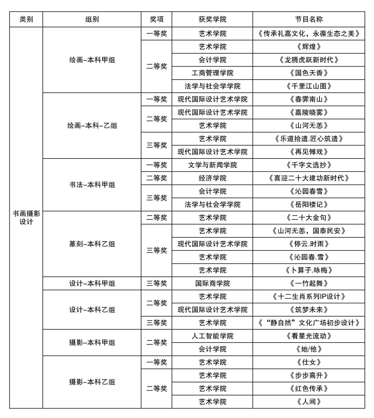 近日,重庆市第七届大学生艺术展演活动落下帷幕,并公布获奖名单。大学生艺术展演活动是重庆市规格最高、规模最大、影响最广的大学生艺术盛会,是高校践行美育育人、落实立德树人根本任务的重要途径。我校共获奖57项,其中一等奖作品16项、二等奖作品29项、三等奖作品12项,在获奖层级、获奖数量上均创历史佳绩。