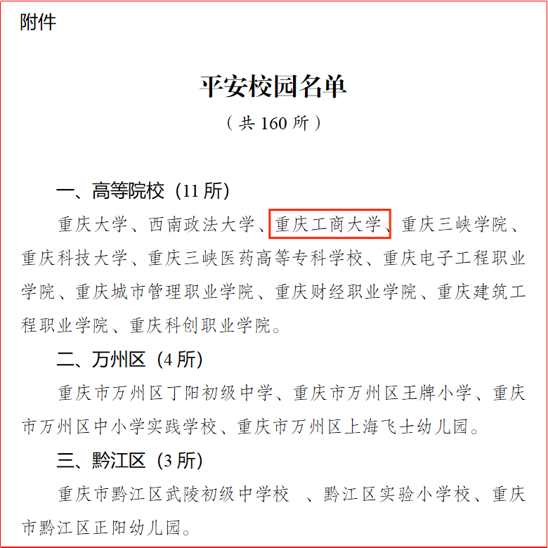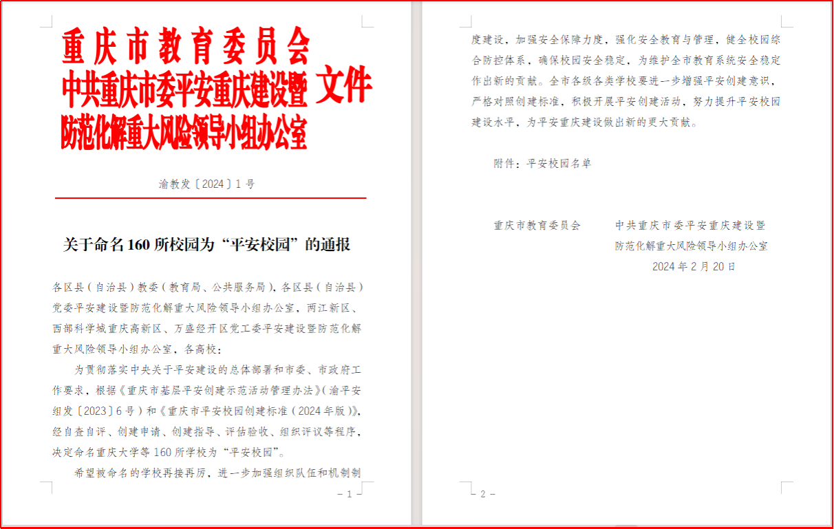 2月20日,重庆市教育委员会、中共重庆市委平安重庆建设暨防范化解重大风险领导小组办公室联合印发《关于命名160所校园为“平安校园”的通报》(渝教发〔2024〕1号),决定命名全市160所学校为“平安校园”,其中,高等院校11所(本科院校5所,高职专科6所),我校位列本科院校第3名。