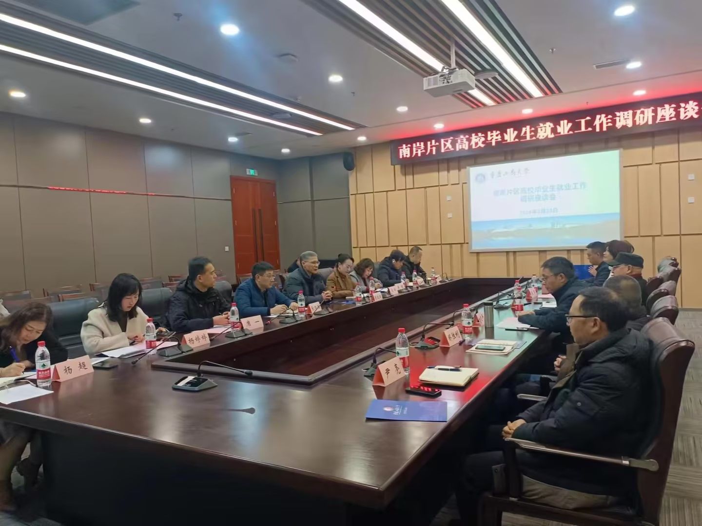 2月29日下午,南岸片区高校毕业生就业工作调研座谈会在我校新图书馆第五会议室召开。市教委学生处处长窦晓明,市大学中专毕业生就业指导服务中心主任唐雪平,学校党委常委、副校长陈运超出席会议,重庆工商大学、重庆邮电大学、重庆交通大学等南岸片区8所高校就业工作负责人,市大学中专毕业生就业指导服务中心相关部门负责人参加会议,会议由唐雪平主持。