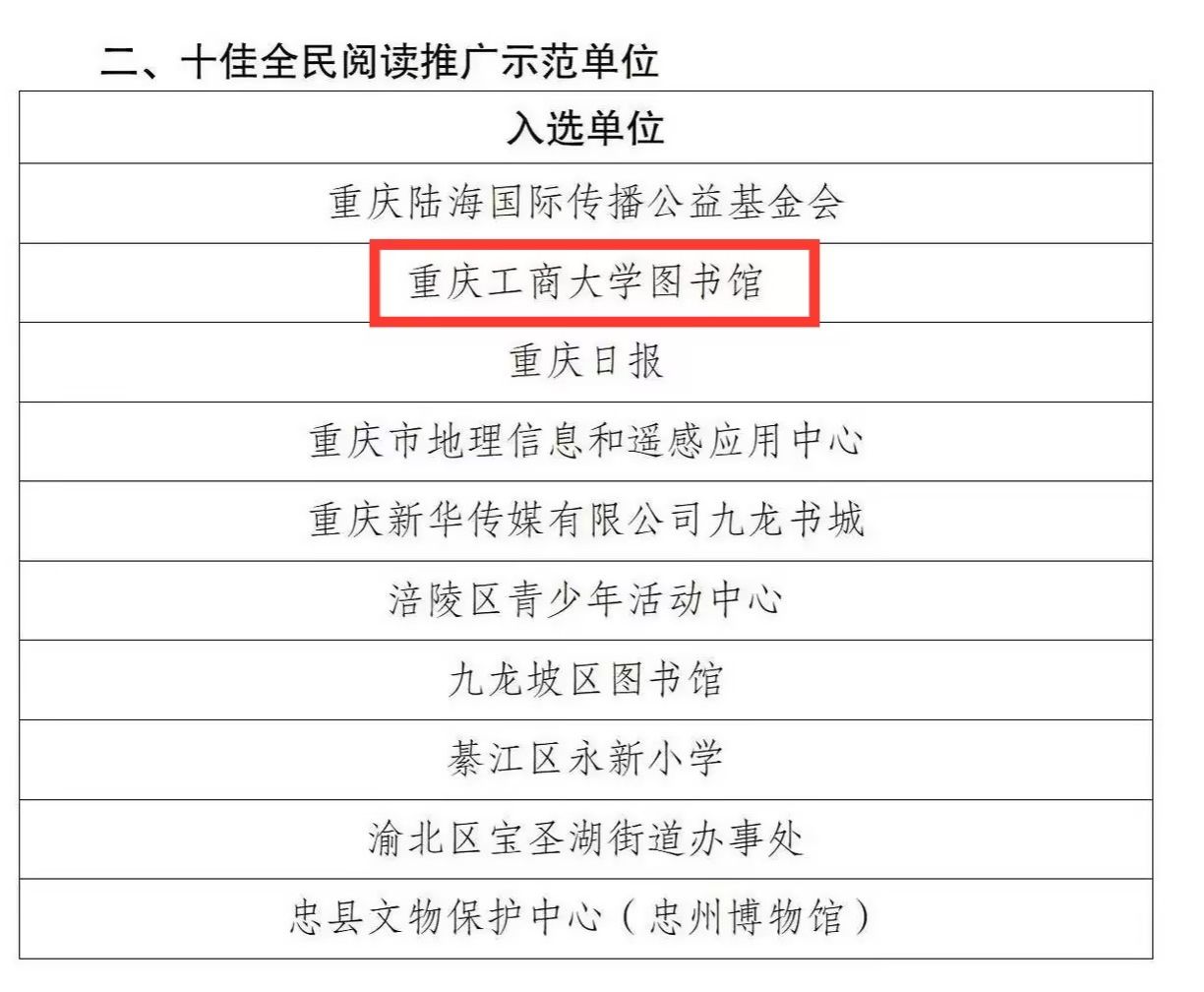 在2023年“书香重庆”全民阅读系列推荐活动中,重庆工商大学图书馆凭丰富多彩的阅读活动、优化阅读环境、推广数字化阅读、参与社会文化公益活动等方式,不但吸引了众多在校师生参与阅读、营造书香校园等方面做出了显著成绩;也在社区文化活动和社会文化公益等方面展现了其大学人文情怀。本次成功获评“十佳阅读推广示范单位”不仅是对我校图书馆长期以来致力于阅读文化建设的肯定,也是对我校图书馆在推动全民阅读工作中所发挥的示范引领作用的认可。