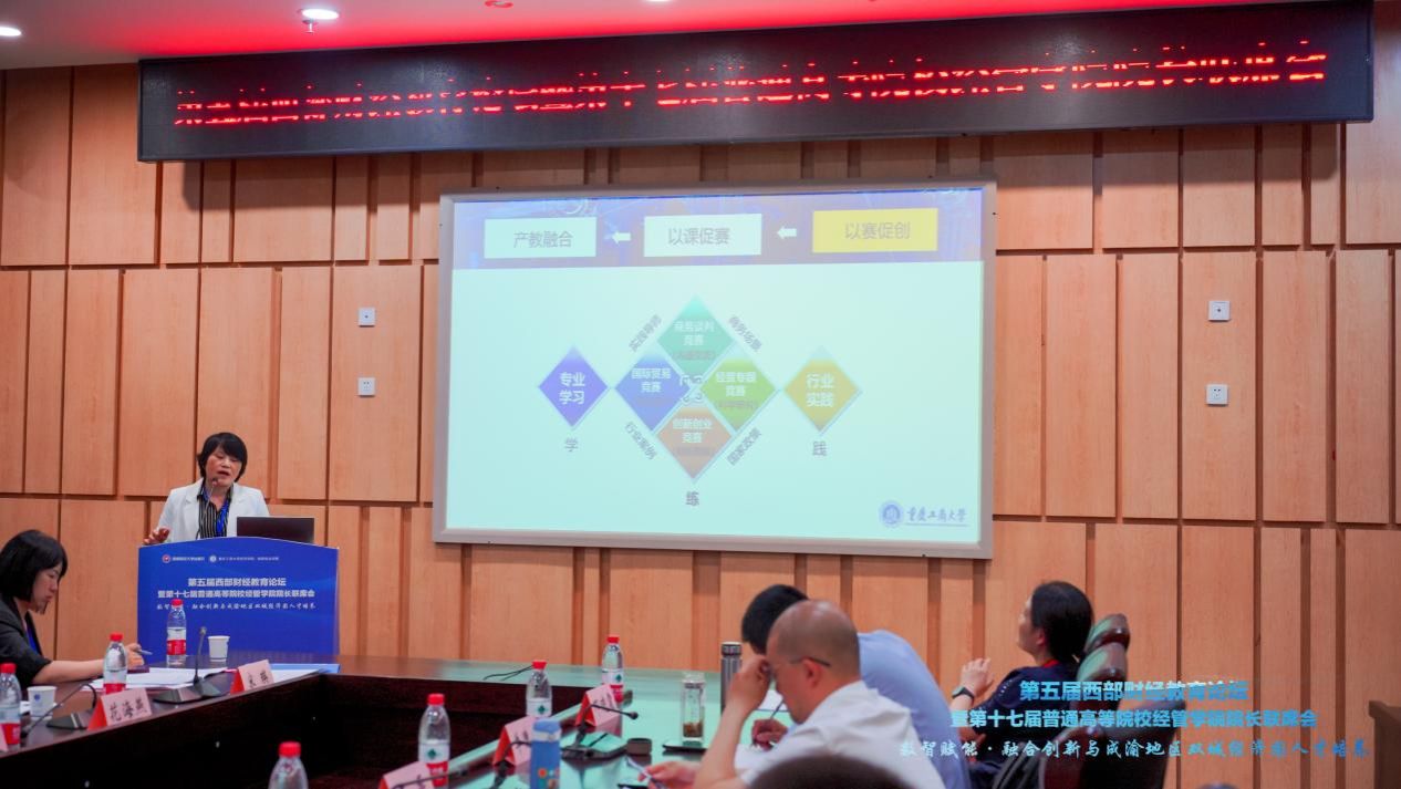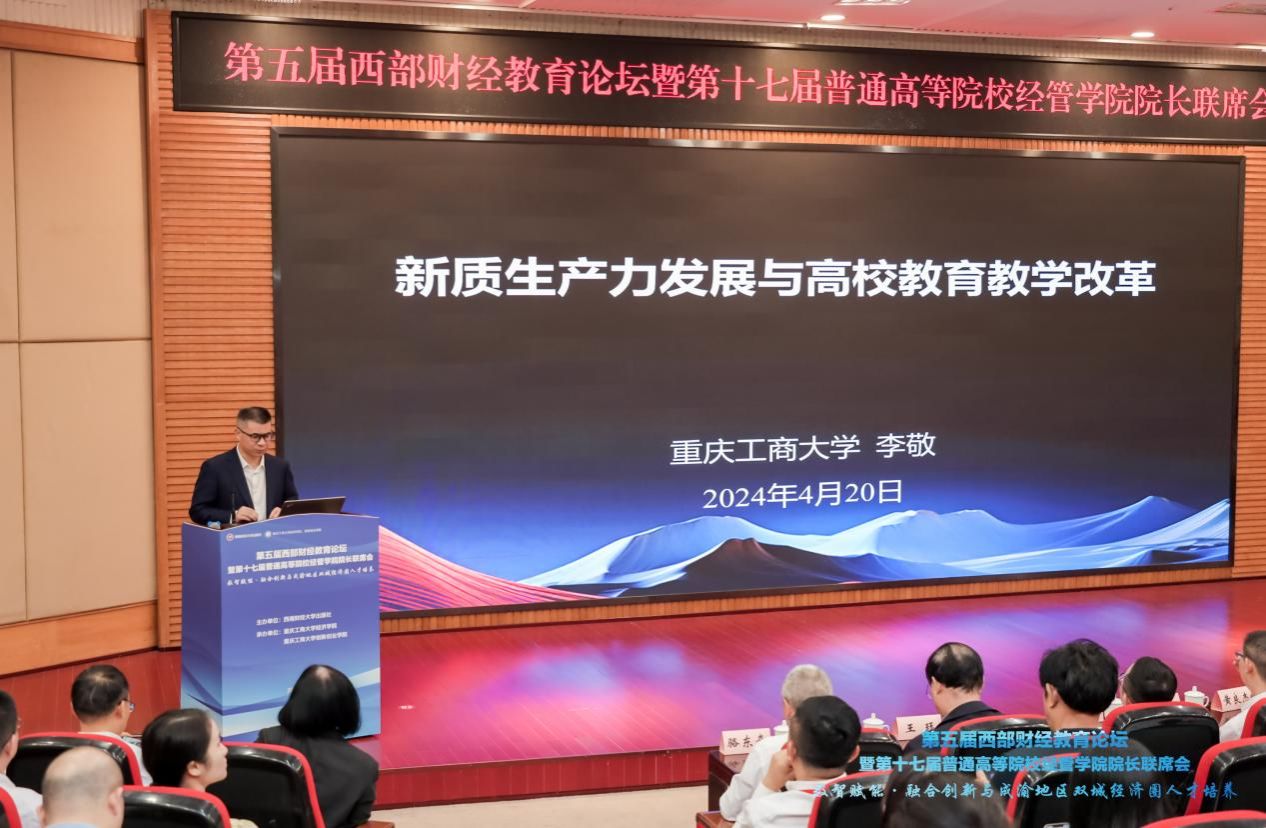 我校经济学院院长宋瑛主持主旨演讲。李敬作关于“新质生产力发展与高校教育教学改革”的主旨演讲,深入阐释了新质生产力的内涵、理论形成、新质生产力理论下高校的教育教学改革关注的内容以及重庆工商大学相关的实践。