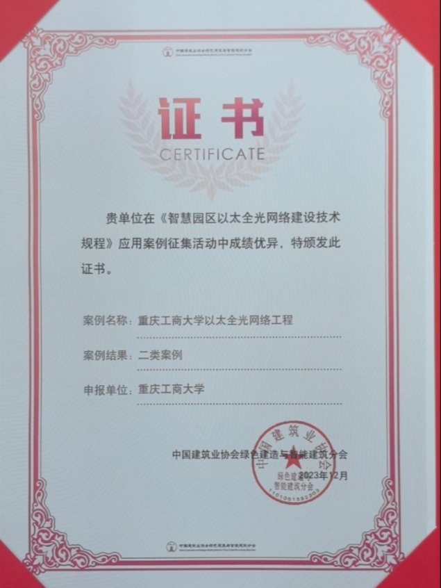 近日,在中国建筑业协会绿色建造与智能建筑分会组织的全光网络建设应用案例征集活动中,我校申报的“重庆工商大学以太全光网络工程”成功入选《智慧园区以太全光网络建设技术规程》二类优秀案例。