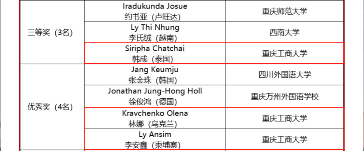 11月9日,由重庆市人民政府外事办公室、重庆市人民对外友好协会主办的@重庆@世界·第二届“TALK IN 重庆”外语演讲大赛决赛在市外事大楼成功举行。经过激烈角逐,我校留学生韩成(泰国)在外籍中文组中获得三等奖,林娜(乌克兰)、李安鑫(柬埔寨)获得优秀奖。