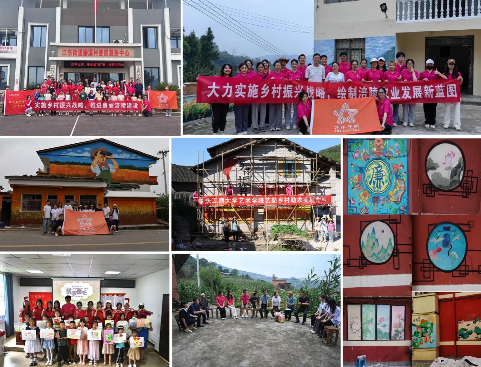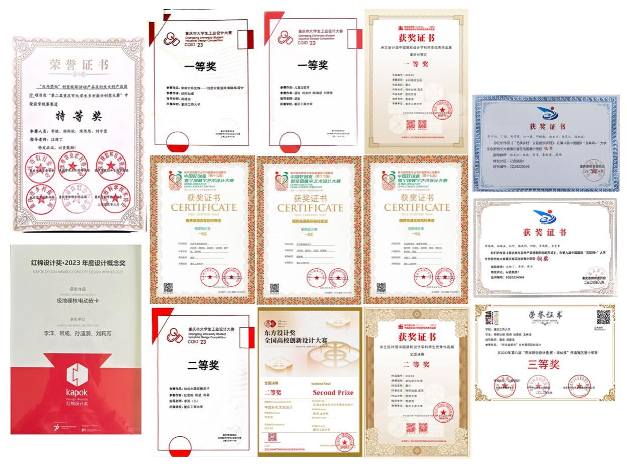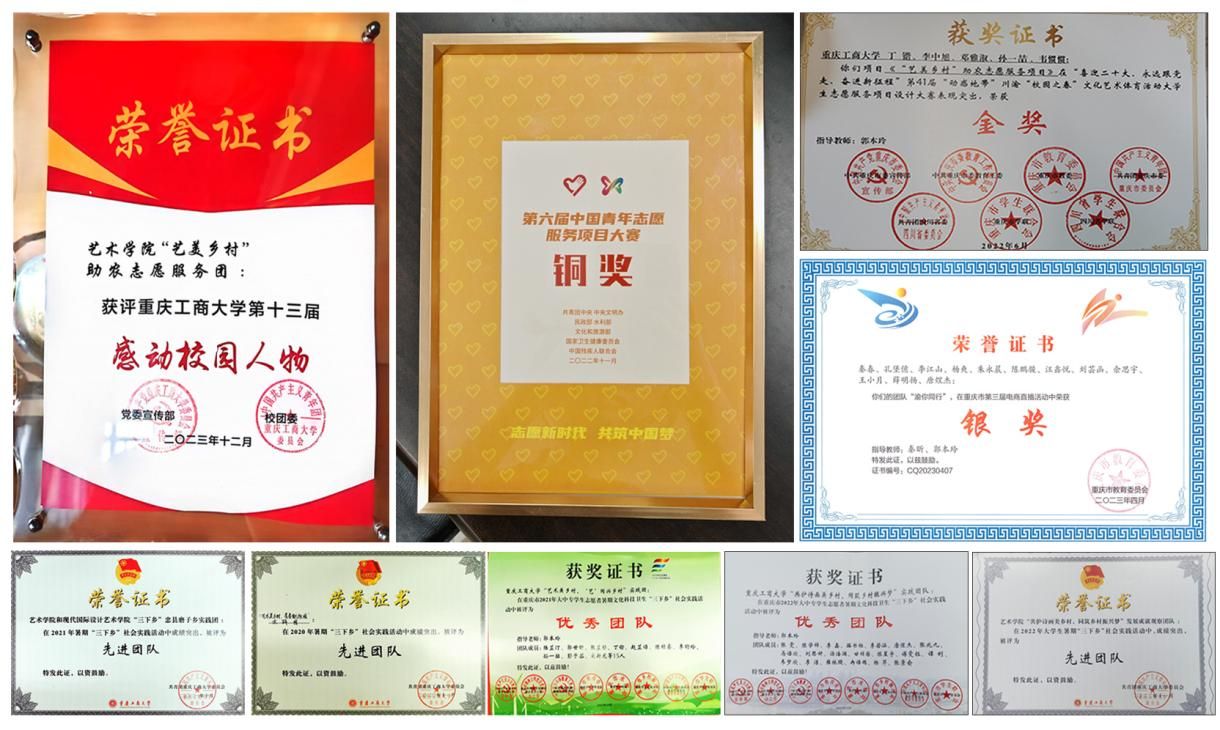 学院通过多维度、立体化的实践方式,培养学生的家国情怀,着力锻造具有社会责任感与创新能力的应用型人才。一是构建“学科竞赛+专题研讨+实践活动”为一体的学生创新创业活动模式。学院严格落实学校2023年修订《普通全日制本科生学科竞赛管理办法》,在“以学促练、以练促赛、以赛促学”的创新探索中提高学生参与创新创业教育活动的积极性。近年来,学院完成30余项大赛的组织工作,获13届全国大学生广告艺术大赛(重庆赛区)优秀组织奖,2023年评为第十五届全国大学生广告艺术大赛全国优秀院校。学生在“互联网+”“挑战杯”“大广赛”等各类赛事中获得省部级及以上奖项600余项;二是积极展开校地合作赋能乡村振兴。将社会实践与思想引领、专业学习、职业规划、社会服务深度融合,形成“校地共建+特色共创”的实践育人模式。与合川区涞滩镇、忠县乌杨镇、石宝镇、磨子乡等地方政府开展以乡村振兴为目的的农特产品包装设计、传统文化创意设计、乡村景观再设计等助农项目,先后完成涞滩镇特产视觉形象与包装设计、铜罐驿镇英雄湾村文创设计、大观镇乡村景观设计、磨子乡廉政文化广场设计等项目并实际应用;三是加强家国情怀培育的社会实践,打造实践项目品牌。近年来,学院“艺美乡村”社会实践项目团队事迹获得中国共青团网、重庆日报、中国青年网、华龙网等多家主流媒体报道,获得社会各界广泛好评,并荣获第六届中国青年志愿服务项目大赛国赛铜奖、重庆市大学生志愿者暑期文化科技卫生“三下乡”社会实践优秀团队、重庆市第三届电商直播银奖以及重庆工商大学第十三届“感动校园人物”(团队)等相关荣誉奖项。