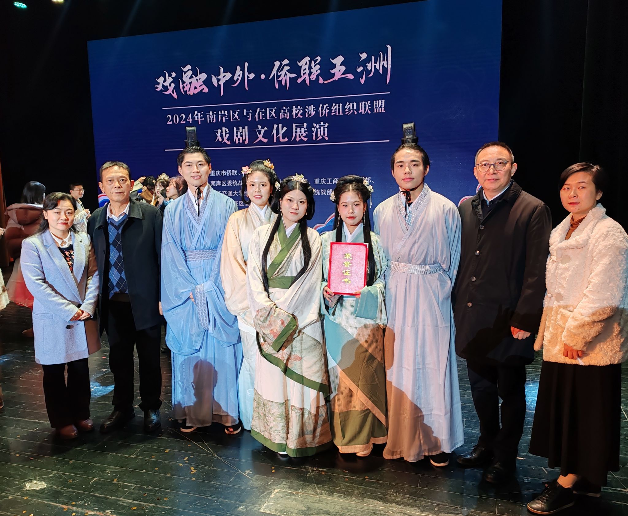 12月7日,南岸区与在区高校涉侨组织联盟“戏融中外·侨联五洲”戏剧文化展演活动在重庆邮电大学举行。中外学生以戏剧为载体开展中外文化交流,生动演绎中国梦。我校留学生院、外国语学院、国际商学院分别组织三个节目《郑人买履》《穿越古今,熔铸现代,引领未来》《新嫦娥奔月》参加展演,并获得二等奖。南岸区四所在区高校的师生及侨胞、侨属400余人观看了展演。