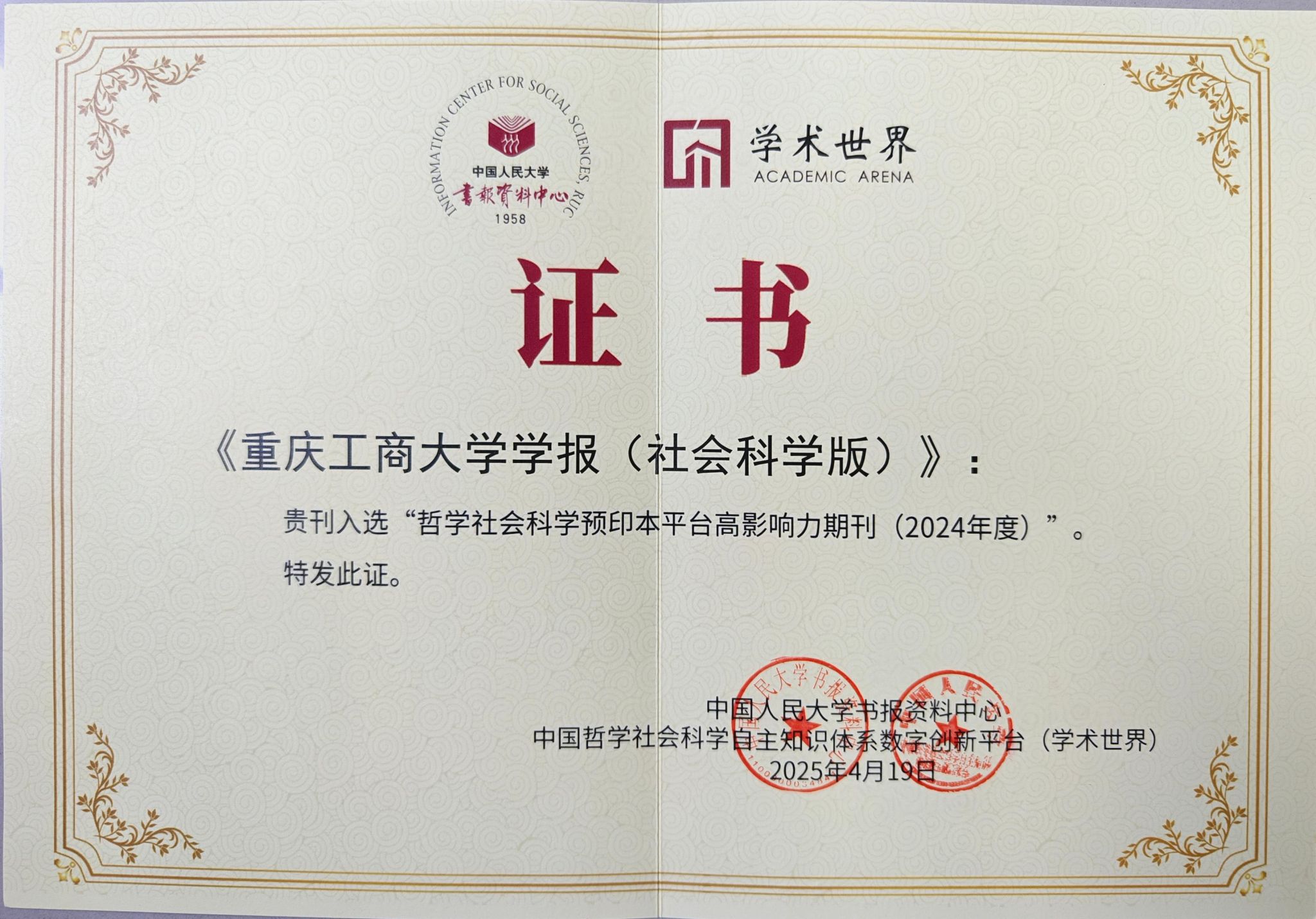 《哲学社会科学预印本平台高影响力论文、期刊评价研究报告(2024年度)》于2025年4月19日在“2025年复印报刊资料转载指数发布暨预印本平台建设论坛”上正式发布。《重庆工商大学学报(社会科学版)》入选“哲学社会科学预印本平台高影响力期刊(2024年度)”。
