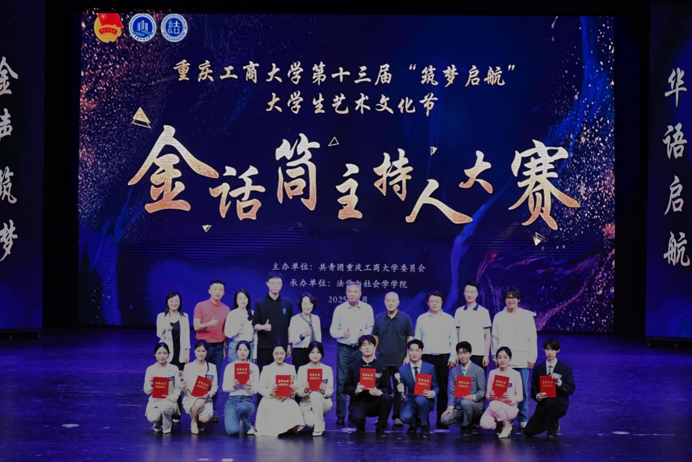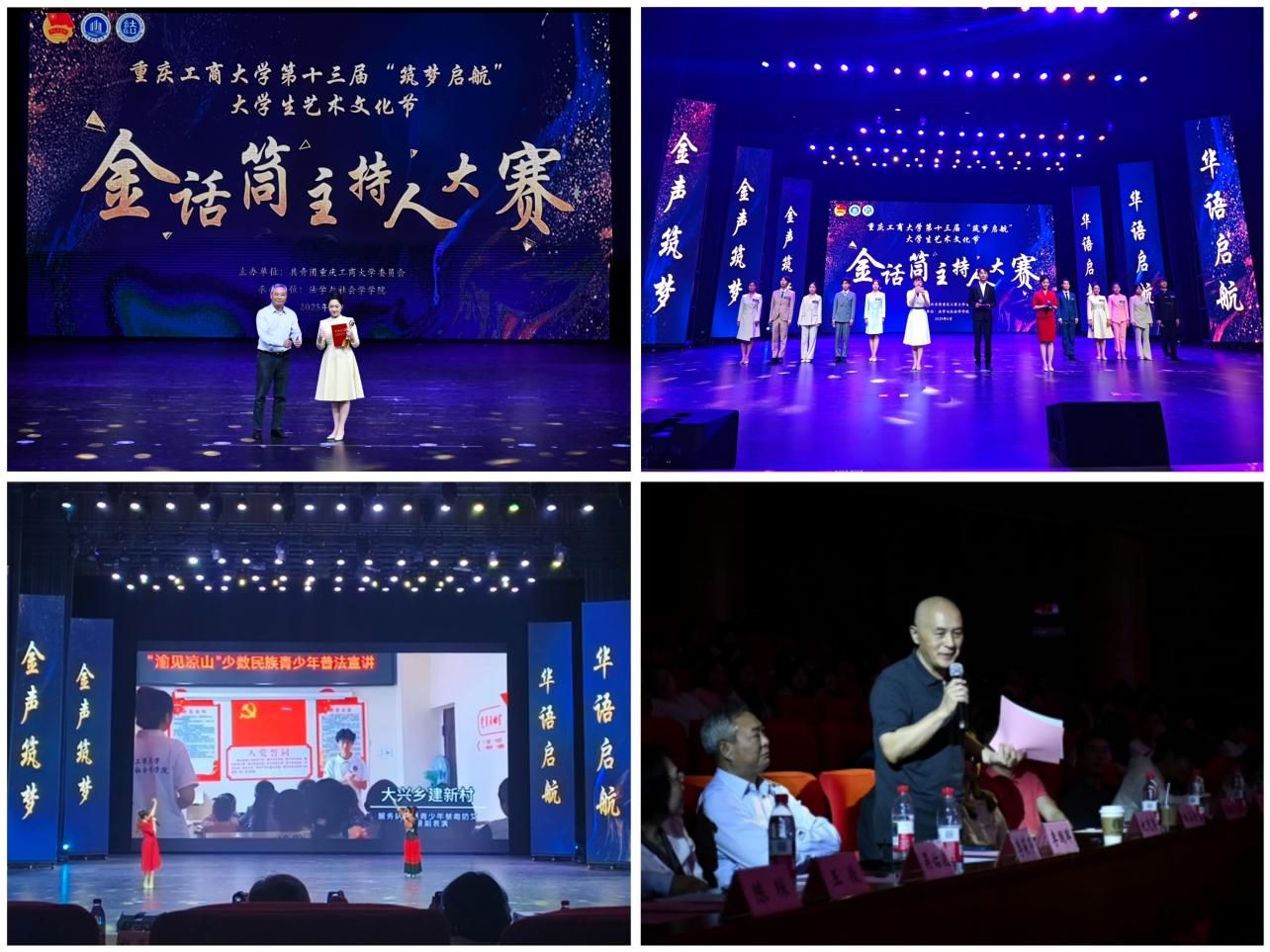 4月18日,由校团委主办、法学与社会学学院承办的重庆工商大学第十三届“筑梦启航”大学生艺术文化节“金话筒”主持人大赛决赛在南岸校区图书馆剧场顺利举办。学校党委常委、副校长李国军,校团委书记吴佑波,副书记王微,法社学院班子成员到场参加。重庆广电集团主任播音员、重庆市电视艺术家协会播音主持专委会主任、“学习强国”学习平台播音朗诵专家团成员祝克非,四川外国语大学新闻传播学院播音与主持艺术系主任、重庆市沙坪坝区哲学社会科学智库特聘研究员林玉佳,重庆广播电视集团(总台)主持人、重庆市广播电视十佳主持人、重庆市电影家协会语言声音艺术专委会理事张枫若,国家二级播音员、渝中区团区委特约评委周黎,重庆工商大学语言艺术分团指导老师江蕊弘等5名专家担任评委。