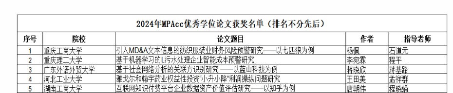 5月7日,全国会计专业学位研究生教育指导委员会公布了2024年MPAcc优秀学位论文奖名单,一共28篇学位论文获奖。我校会计学院杨佩同学撰写(指导教师:石道元教授)的论文《引入MD&A文本信息的纺织服装业财务风险预警研究——以七匹狼为例》获奖。