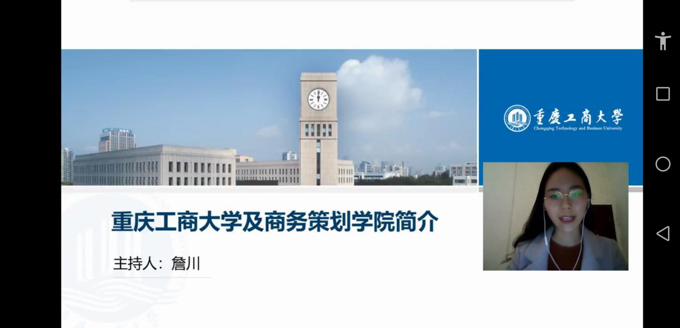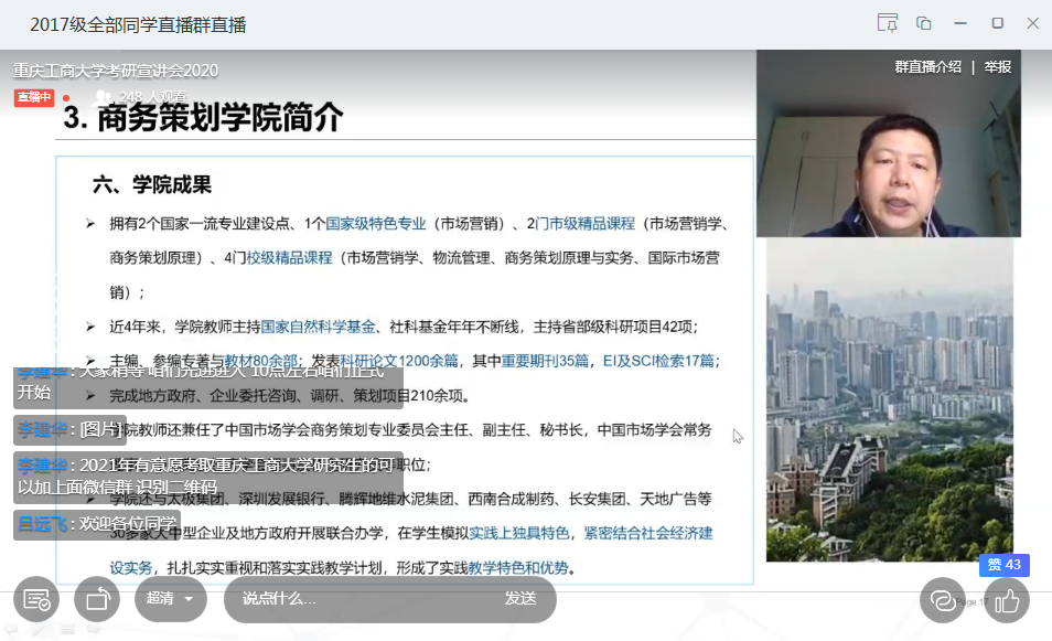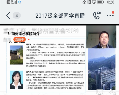 此次宣讲会经过数次与河南师范大学辅导员李建华老师沟通、协调得以如期举行。宣讲会通过钉钉直播的形式进行,河南师范大学商学院2017级、2018级部分未来有意考研的同学共600余人参与了此次直播。詹川首先介绍了重庆作为西部地区唯一的直辖市所具有的地域特点及发展优势,并对重庆工商大学的办学规模、研究生师资及研究生培养情况作了简要介绍。接着,詹川详细介绍了商务策划学院企业管理及技术经济及管理学术硕士、国际商务专业硕士的专业设置、办学特点、师资力量、培养模式、学生就业以及奖助体系等情况。随后,学院2017级技术经济及管理专业研究生、河南师范大学校友李肖依同学,分享了她的考研历程及读研期间的个人感悟和收获。此次线上宣讲会还对2021年有意报考重庆工商大学硕士研究生的同学们进行答疑解惑,以便同学们更加了解我校,认识当前考研形势,以及制定切实有效的考研计划。