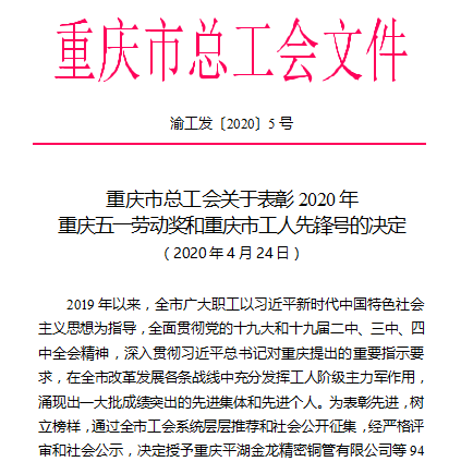 近日,重庆市总工会发布了《关于表彰2020年重庆五一劳动奖和重庆市工人先锋号的决定》,表彰一批为全市经济建设和社会发展及抗击“新冠”肺炎疫情工作中做出突出贡献的先进集体和先进职工。我校荣获“重庆五一劳动奖状”。