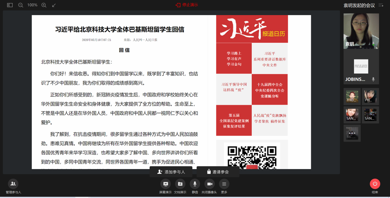 同时,留学生院组织在校留学生围绕习近平主席给巴基斯坦留学生的回信开展了交流分享会,对回信内容进行了细致解读,对外汉语教师们也通过在线课堂等各种方式与境外留学生分享、交流了回信的内容与重要意义。