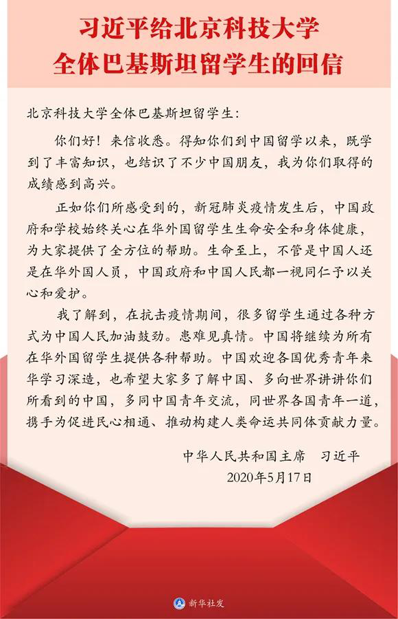 国家主席习近平5月17日给北京科技大学全体巴基斯坦留学生回信。信中,习近平对各国优秀青年来华学习深造表示欢迎,并强调中国政府和学校始终关心在华外国留学生生命安全和身体健康,将继续为留学生们提供全方位的帮助。习近平鼓励留学生们多同中国青年交流,同世界青年一起携手同心,共建人类命运共同体。