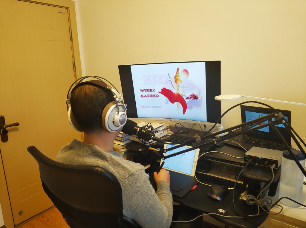王佳鑫,男,重庆工商大学马克思主义学院专职教师。线上授课是一次展示自己教学课件和教学语言功底的宝贵机会。如何通过线上教学这一特殊方式为学生讲好马克思主义哲学、让学生真懂真信马克思主义政治经济学,是促使他为教学做精心准备的原动力。在学校线上教学通知下达后,他便迅速采购了各类视频、音频设备,在不断摸索下成功组建了直播平台,并做好了调试。他在线上教学时,为需要详细讲解的页面留下了比较多的空白,充分利用手写笔这一重要工具,即时标记重点和书写板书,增强了学生上课的参与度,使教学实时展示有了更大的自由度。王老师说,“从教学结束后学生的反馈来看,有了‘好声音’,才能出‘好戏’,一套好设备至少可以让学生听起课来没那么烦躁。许多学生纷纷给我留言,虽然有些想法很‘调皮’,但更多的还是真诚的支持和鼓励。”