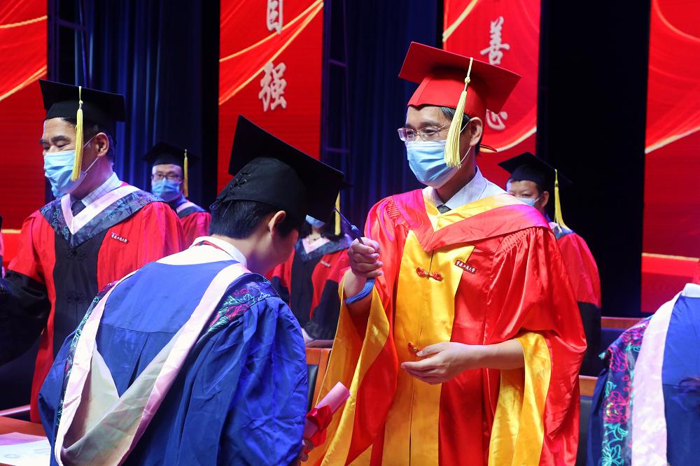 在雄壮的国歌声中,毕业典礼正式开始。首先,何勇平副校长宣读了《关于授予蒙兰佳等6268名普通全日制本科学生学士学位的决定》,校领导为2020届本科毕业生代表颁发毕业证书并授予学士学位。柏群副校长宣读了《重庆工商大学关于授予周超等606名同学博士、硕士学位的决定》,校领导为毕业硕士研究生代表颁发毕业证书并授予硕士学位。陈运超副校长宣读了《关于表彰2020届优秀大学毕业生的决定》和《关于表彰2020届优秀毕业研究生、优良毕业研究生的决定》,校领导分别为优秀本科毕业生、优秀毕业研究生代表颁发了荣誉证书,勉励他们今后在各自的岗位上奉献社会,建设国家。