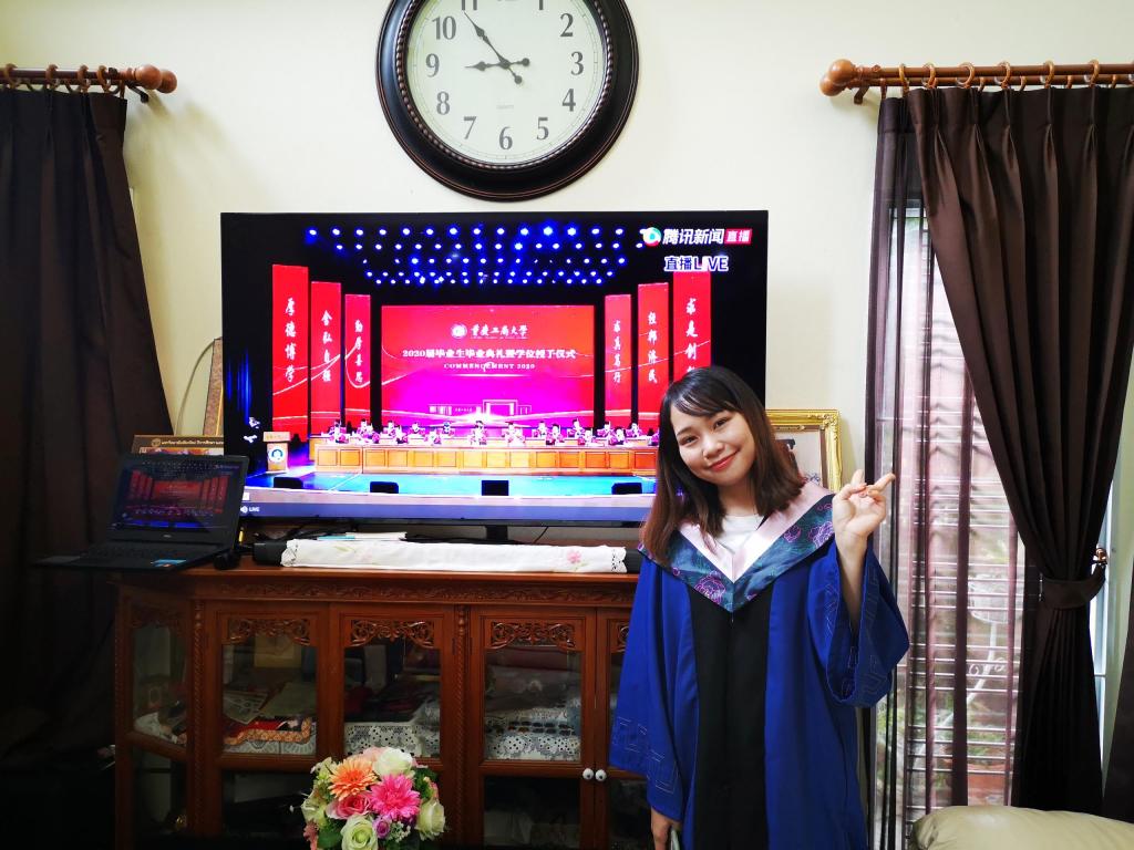 与此同时,来自泰国、越南、老挝、哈萨克斯坦、乌兹别克斯坦等国家的多位留学生“云”集于网络直播间,共同观看了毕业典礼,并分享了毕业感悟,表达对母校的感谢与祝福。我校越南籍国际经济与贸易专业本科生文财今天特意向公司请了假,专心观看毕业典礼。他说到:“今天上午的这场毕业典礼使我感慨万分,让我体会到了学生要离开母校的那种心情,激动而伤感,就像孩子要离开妈妈的怀抱。在重庆工商大学学习的这几年,成为我一生中最重要的财富。感谢老师们对我的培养、支持与照顾。”来自泰国的企业管理专业研究生邱丽芳更是在家里穿着学位服观看了毕业典礼,仪式感十足。重庆工商大学对他们来说,早已不是路过的风景,而是实实在在温暖的家!