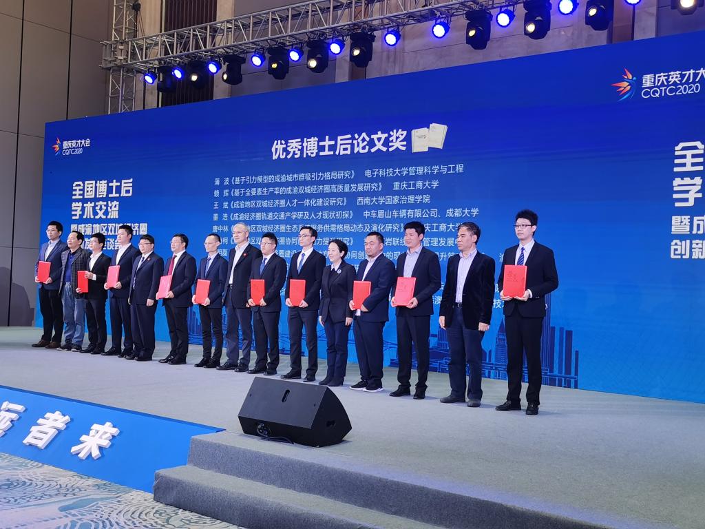 屈谦为本次座谈会致欢迎词。会议现场播放了《成渝地区双城经济圈与RCEP国家贸易关系报告》,报告首次发布宣传片,并且为感谢我校应用经济学博士后团队在此项研究中作出的积极贡献,组委会专门授予特别成果奖。汤涛和屈谦为我校应用经济学博士后团队代表成肖和林黎颁奖。参会领导与嘉宾为本次活动优秀博士后论文奖获奖者颁奖。