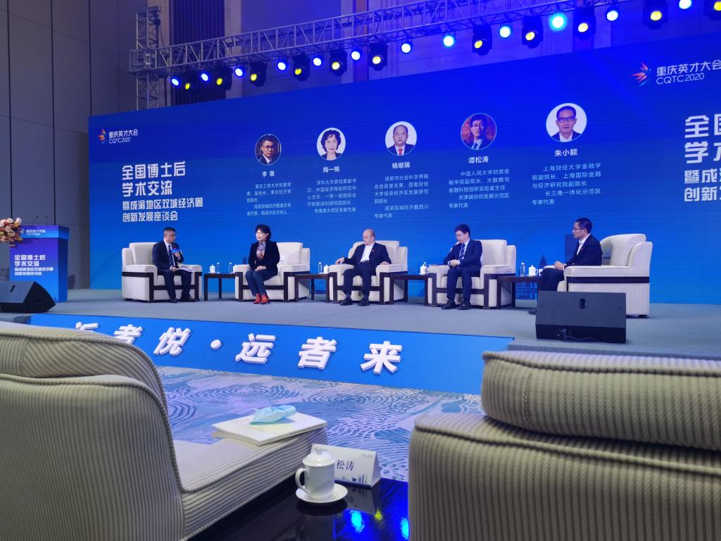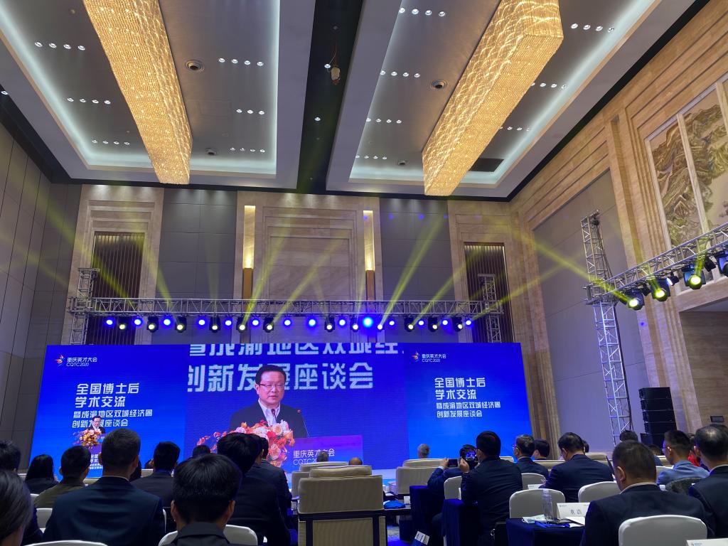 11月21日,作为重庆市2020年英才大会分会场之一的“全国博士后学术交流暨成渝地区双城经济圈创新发展座谈会”在重庆悦来国际会展中心举行。本次会议由全国博士后管委会办公室、重庆市人力资源和社会保障局等单位主办,由重庆工商大学承办,重庆工商大学长江上游经济研究中心是主要协办单位之一。来自中国人民大学、四川大学、重庆大学、西南大学、西南财经大学、重庆工商大学、重庆医科大学等科研院所、高校、党校行政学院、政府机构和企业的专家学者、政府官员及媒体记者共150余人参加了本次座谈会。