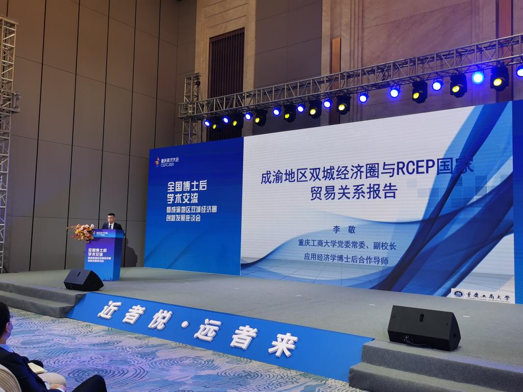 在主题演讲和学术交流环节,国家发改委国土开发与地区经济研究所所长高国力研究员通过视频的方式分享了题为“全面提升成渝地区双城经济圈的战略位势”的大会报告。获奖博士后电子科技大学蒲波和重庆工商大学赖辉应邀作了主题发言。李敬现场作了《成渝地区双城经济圈与RCEP贸易关系数据发布报告》,获得全场好评。