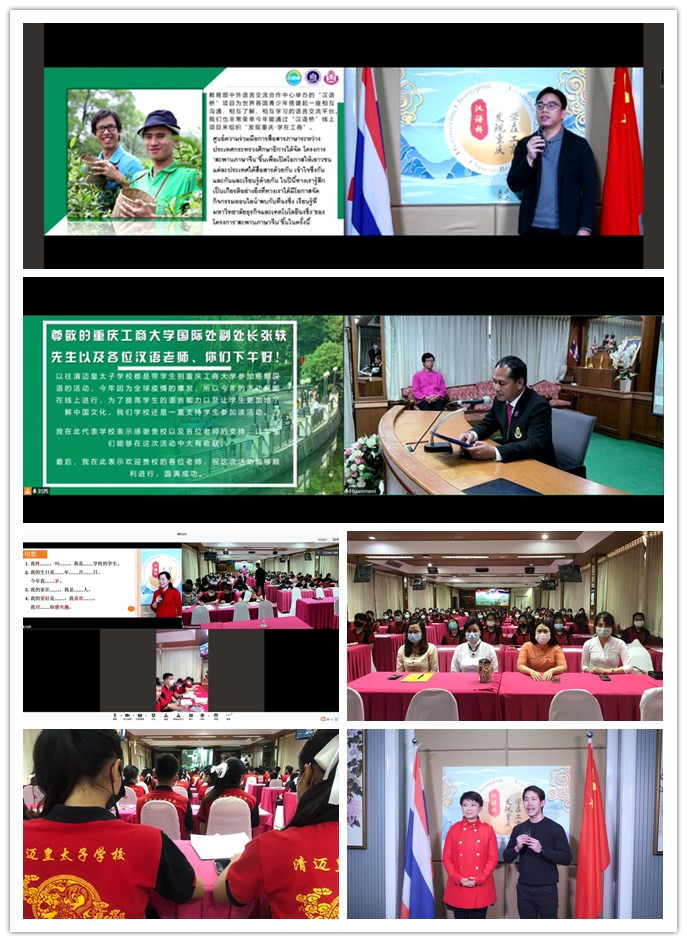 由中外语言交流合作中心主办,我校承办的“发现重庆·学在工商”--2020年“汉语桥”线上冬令营于12月24日在图书馆智慧教室以网上直播方式开营。来自泰国清迈皇太子学校的师生80余人通过直播平台参与了冬令营开幕式。