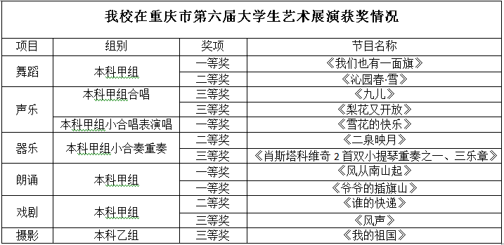 近日,重庆市第六届大学生艺术展演活动顺利举行,我校学子在展演活动中表现突出,获本科甲组一等奖4项,二等奖3项、三等奖3项,获本科乙组三等奖1项。