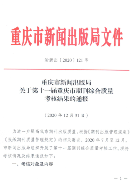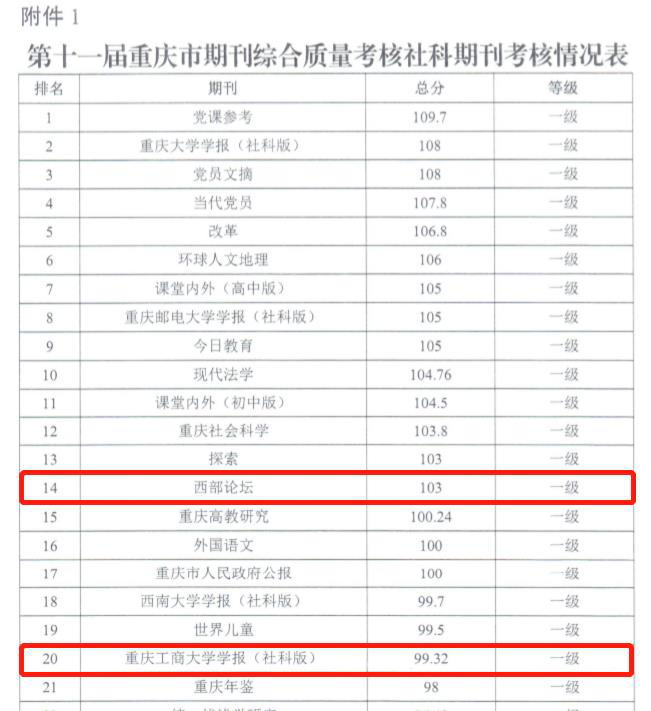 本次考核对象为全市所有正常出版的134种期刊,考核内容主要是2019年度和2020年度期刊出版情况,得分90分以上(含90分)的期刊为一级期刊。《西部论坛》《重庆工商大学学报(社会科学版)》分别得到103分和99.32分。