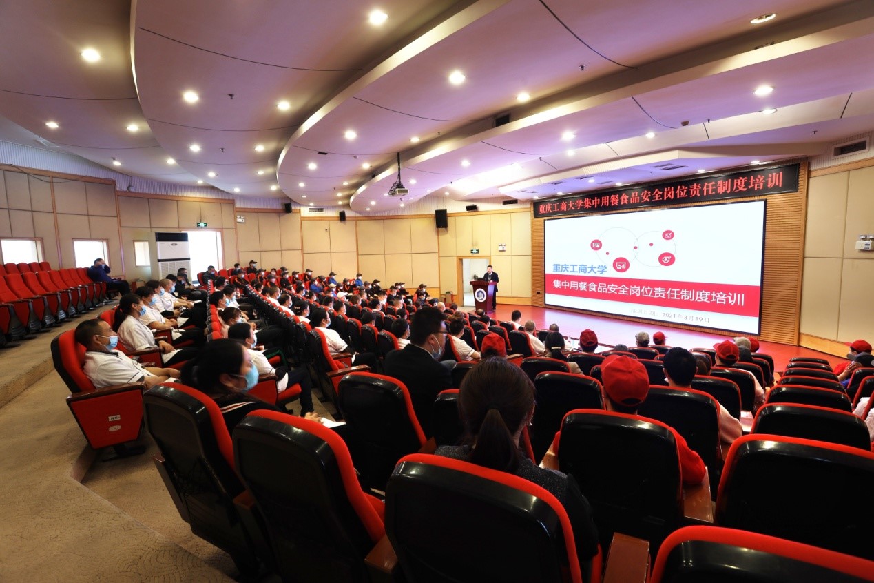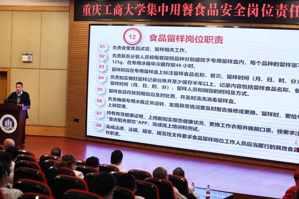 为保障学校师生食品安全,健全食品安全管理制度,明确食品安全工作责任,加强食品安全管理,根据《重庆市市场监督管理局 重庆市教育委员会关于建立学校及幼儿园集中用餐食品安全岗位责任制度的通知》(渝市监发〔2021〕14号)要求,我校于3月8日召开校长办公会,讨论通过了《重庆工商大学集中用餐食品安全岗位责任制度》,将上级部门对校园食品安全要求进行细化、分解,明确从校长到一般食品安全从业人员等相关责任人员的食品安全工作任务;对校园食品安全主体责任、第一责任、主要责任、直接责任等进行清晰地界定,确保做到责任落地、落实。3月19日下午,我校在博智楼7200报告厅召开培训会,后勤处处长沙云对《重庆工商大学集中用餐食品安全岗位责任制度》逐条、逐项并结合案例进行培训讲解,要求每个岗位做到人人知晓、责任清楚、任务明确。后勤处饮食科,校内各餐饮公司负责人、幼儿园负责人、各食堂经理、各食堂班组骨干人员等200余人参加了培训会。