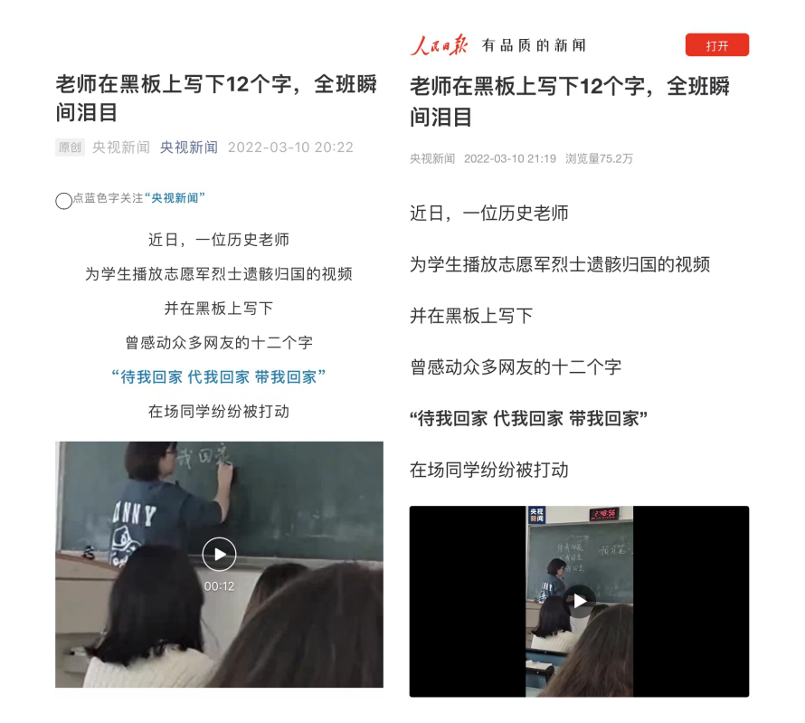 据悉,魏新欣老师当天正在给我校艺术学院2021级服装与服饰设计专业学生上《中国近现代史纲要》课,利用课间播放了短视频《那年那兔那些事儿》,结尾的部分有关于抗美援朝志愿军烈士遗骸被交接回国的内容,在播放过程中,她发现同学们目不转睛地盯着屏幕看,于是她想到,抓住此时此刻学生的共情点和共鸣点,加深大家对抗美援朝这段历史的认识,把这门思想课上“活”、上“浓”、上“温暖”,随即就在黑板上写下了“待我回家 代我回家 带我回家”这三行字。正是因为这三行字,让学生们在看视频的同时备受震撼,一些学生不禁感动落泪,其中一名学生将这个过程用手机记录了下来,放到网络上,希望将这一场生动的思想政治理论课分享给更多人看到,一下子就引来众多网友点赞和转发。