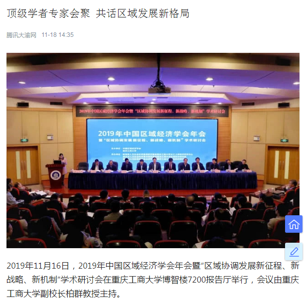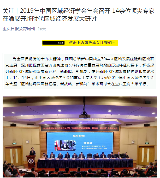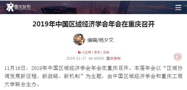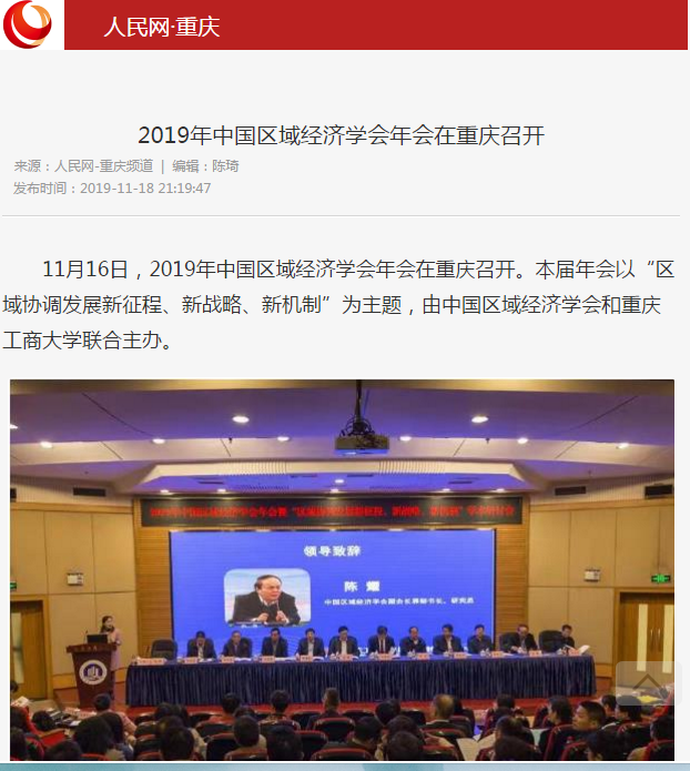 2019年11月15日-16日,2019年中国区域经济学会年会暨“区域协调发展新征程、新战略、新机制”学术研讨会在我校召开,来自中国社会科学院、武汉大学、四川大学、中央民族大学、湖南大学、西南财经大学、中央财经大学、湖北省社会科学院、河南省社会科学院等各地科研院所、高校、党校行政学院、政府机构和企业的专家学者、政府官员及媒体记者共300多人参加了本次研讨会,并邀请了《中国工业经济》《中国高校社会科学》《改革》《经济学家》《当代经济研究》《财经科学》《经济纵横》《经济与管理研究》《宏观质量研究》《软科学》《经济与管理评论》《区域经济评论》《西部论坛》多家学术期刊参会交流。本次年会由中国区域经济学会、重庆工商大学主办,由教育部人文社会科学重点研究基地重庆工商大学长江上游经济研究中心、重庆市人文社会科学重点研究基地重庆工商大学区域经济研究院、重庆市人文社会科学重点研究基地重庆工商大学产业经济研究院承办,由中国社会科学院西部发展研究中心、重庆市区域经济学会、区域经济评论杂志社、改革杂志社、《西部论坛》编辑部协办。