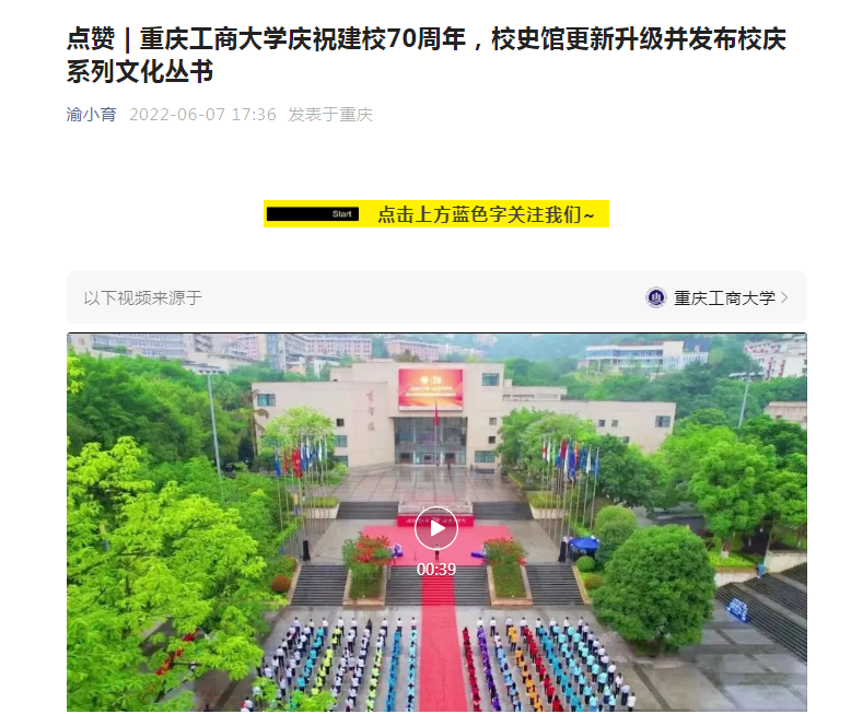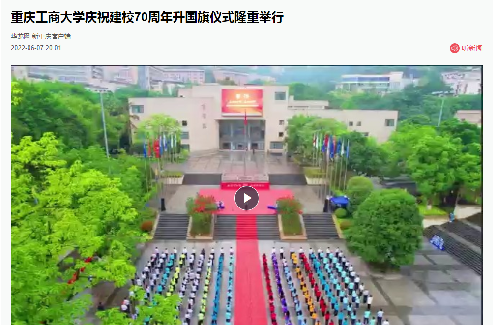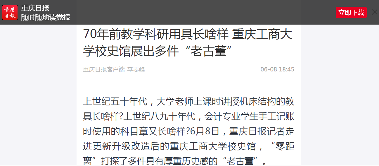 近日,重庆日报、华龙网等媒体报道我校庆祝建校70周年系列活动。6月7日,重庆日报微信公众号“渝小育”以“点赞 | 重庆工商大学庆祝建校70周年,校史馆更新升级并发布校庆系列文化丛书”为题报道我校建校70周年升国旗仪式和校史馆更新升级开馆。6月7日,华龙网-新重庆客户端以“重庆工商大学庆祝建校70周年升国旗仪式隆重举行”为题报道我校建校70周年升国旗仪式。6月8日,重庆日报客户端以“70年前教学科研用具长啥样 重庆工商大学校史馆展出多件‘老古董’”为题报道我校校史馆更新升级。