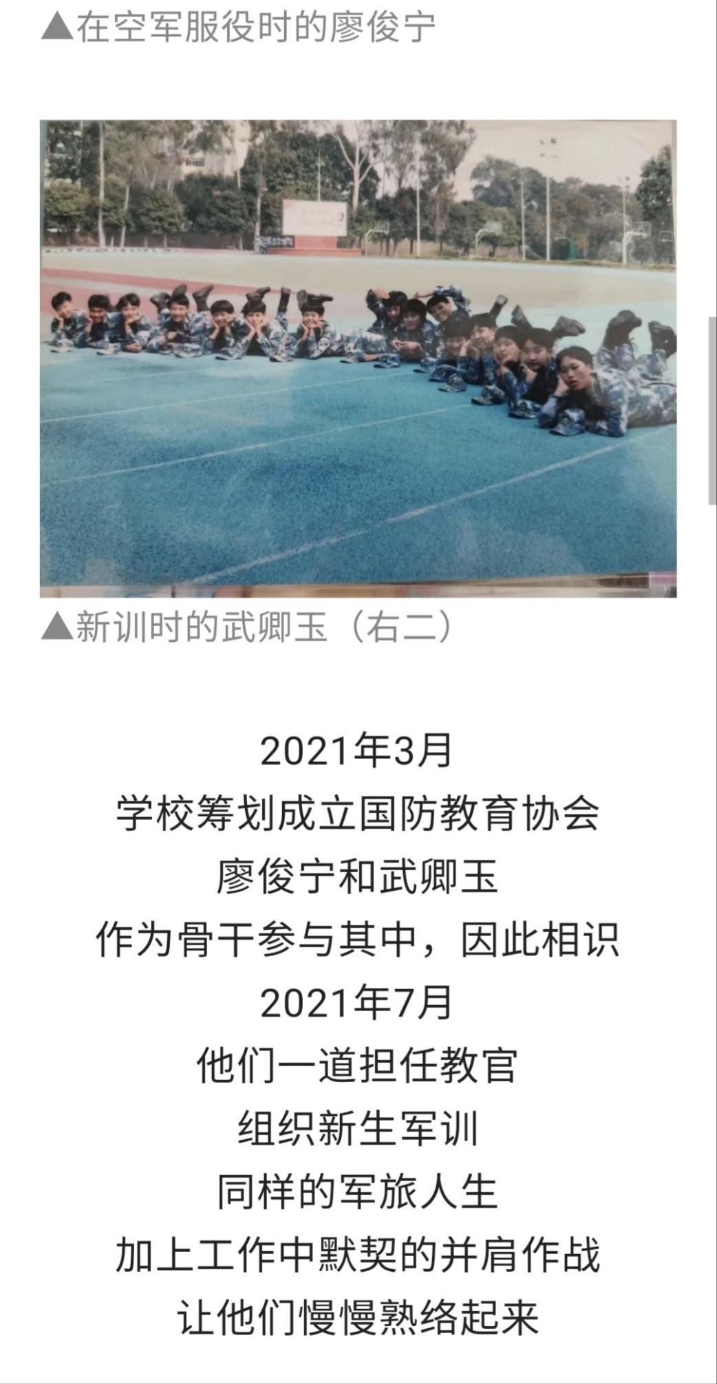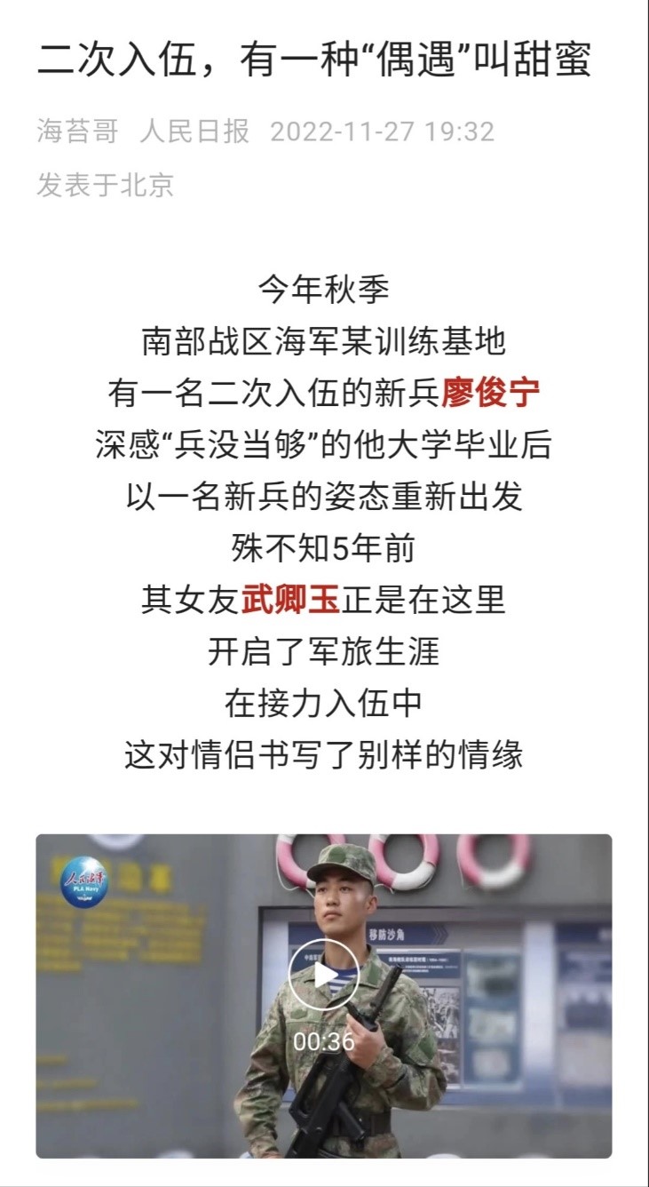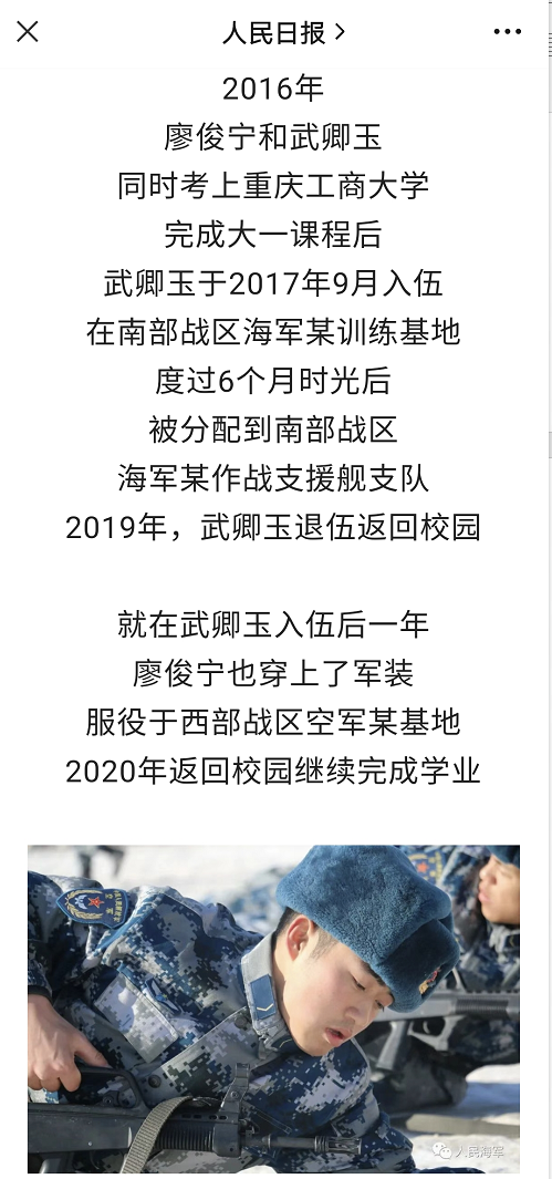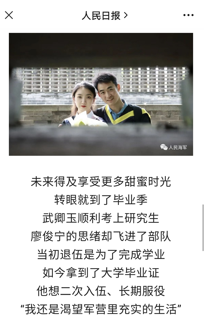 近日,人民日报和由海军政治工作部主管的人民海军微信公众号等主流媒体报道了毕业于我校的2022届机械工程学院廖俊宁同学和2022届工商管理学院武卿玉同学的从军事迹。他们这对学生情侣相继入伍、从军报国,书写了新时代青年的责任担当。为他们点赞!