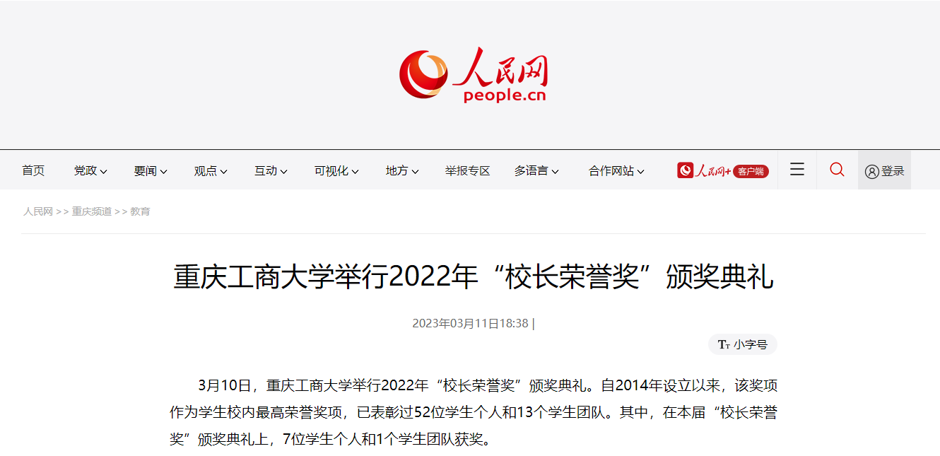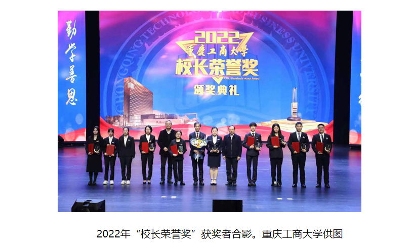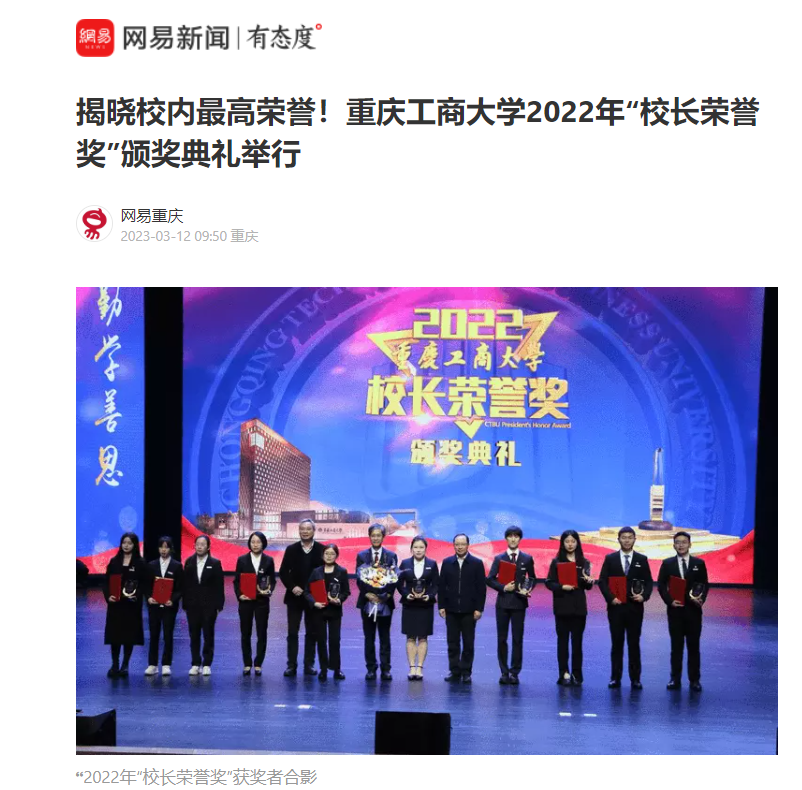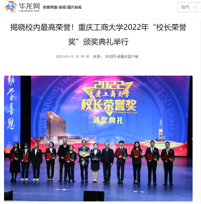 3月10日下午,学校在南岸校区剧场举行2022年“校长荣誉奖”颁奖典礼。人民网以《重庆工商大学举行2022年“校长荣誉奖”颁奖典礼》为题,华龙网、网易新闻以《揭晓校内最高荣誉!重庆工商大学2022年“校长荣誉奖”颁奖典礼举行》为题,对颁奖典礼进行广泛报道。