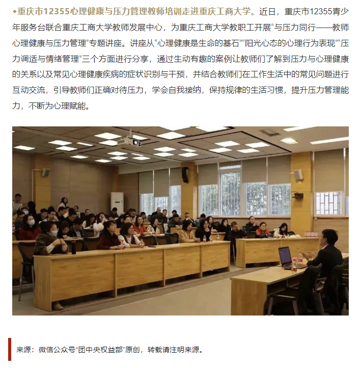 为帮助我校教师提高心理素质和心理调适能力,3月17日上午,教师发展中心联合重庆市12355青少年服务台、重庆市青春导航青少年发展服务中心,特邀重庆市委党校心理学教师、教育部“国培计划”授课专家唐溢,为我校教职工开展“与压力同行—教师心理健康与压力管理”专题讲座。团中央权益部微信公众号对活动进行了宣传报道。