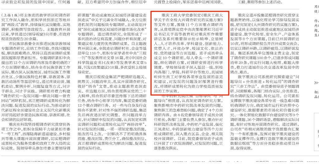5月16日,重庆日报以《重庆第一批主题教育单位扎实开展调查研究》为题,报道我校扎实开展调查研究。报道中指出,学校党委制定《重庆工商大学关于在全校大兴调查研究的实施方案》等文件方案,围绕11个方面重点调研内容,从贯彻落实党中央决策部署和习近平总书记关于高等教育和对重庆所作重要讲话及系列重要指示批示精神、立德树人、人才培养改革、学科建设、创新能力、党管人才、开放办学、校园文化、依法治校、党的建设等方面选题。班子成员牵头成立10个调研组,每人牵头一个调研课题,细化调研方案,对调研安排进行科学调度。学校领导班子深入基层一线,到校内各部门、学院、科研平台等地方,真诚倾听师生员工对学校各项事业发展的意见和建议,对发现的问题及时部署进行整改,将调研成果转化为助力学校高质量发展的工作实效。