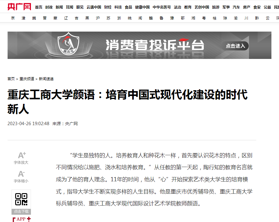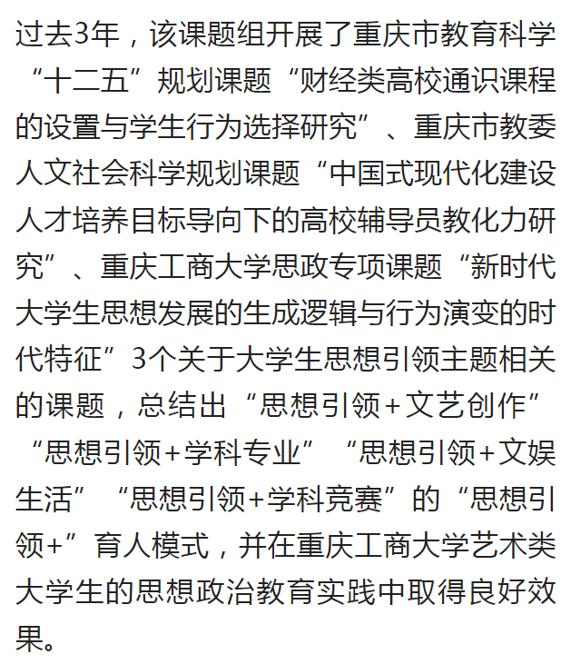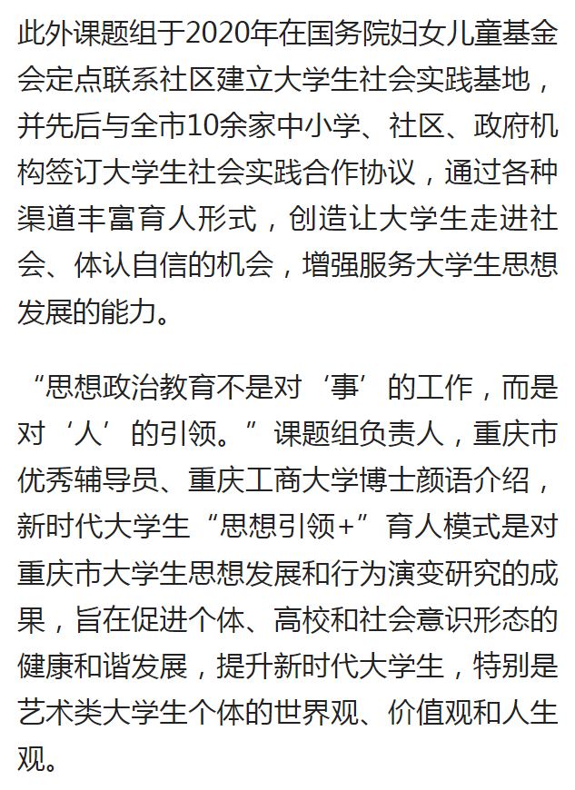 近日,重庆日报客户端、央广网报道了我校探索大学生思想政治教育新途径和新模式的成果。该成果依托党委学工部立项的辅导员思想政治教育专项研究课题及辅导员工作室,围绕新时代大学生的思想变化和行为特征,探索“思想引领+文艺创作”、“思想引领+学科专业”、“思想引领+文娱生活”、“思想引领+学科竞赛”的融合育人模式,并将育人模式在国务院妇女儿童基金会定点联系的社区开展劳育活动进行实践,校社齐力共同探索时代新人培育的新途径。