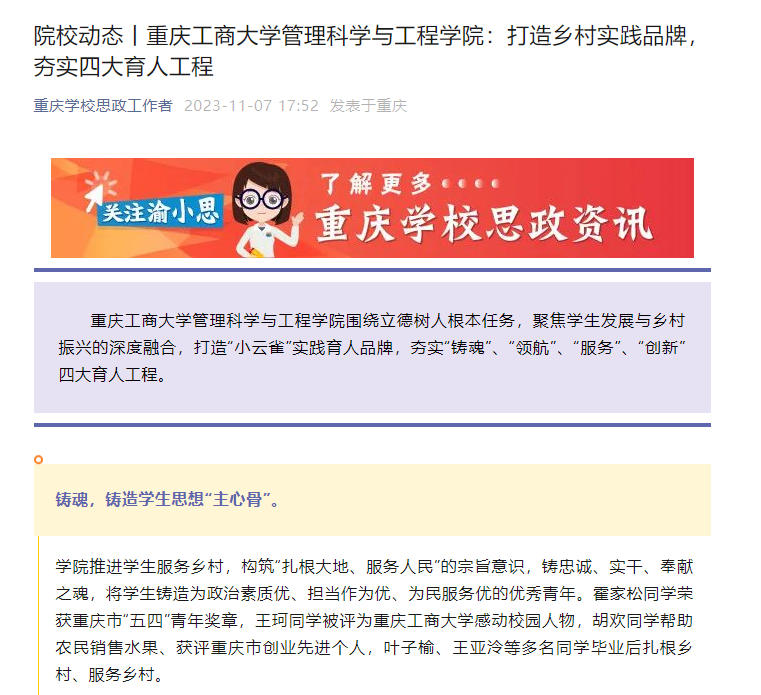 原文链接:重庆工商大学管理科学与工程学院:打造乡村实践品牌,夯实四大育人工程https://mp.weixin.qq.com/s/Vhntf0fWHQnfBnYlUECjxw