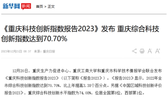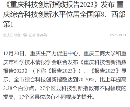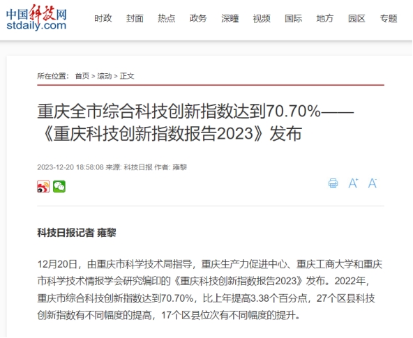 12月20日,重庆生产力促进中心、重庆工商大学和重庆市科学技术情报学会联合发布《重庆科技创新指数报告2023》。该报告由重庆工商大学数学与统计学院“重庆科技创新指数编制”项目组研究完成。新华网、中国科技网、重庆日报客户端、上游新闻、七一网、搜狐网、新浪网等多家媒体对本次发布会进行了报道。