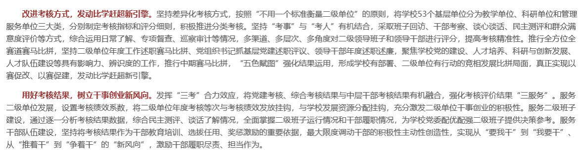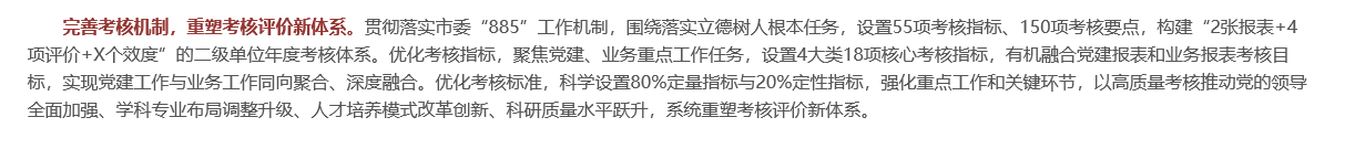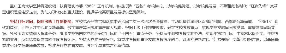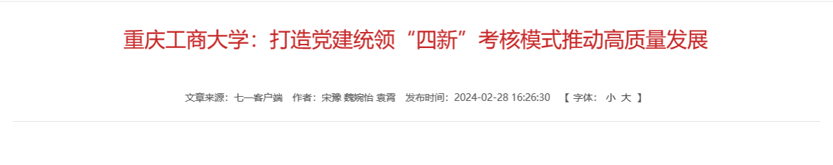 重庆工商大学坚持党建统领,认真落实市委“885”工作机制,积极打造“四新”考核模式,以考核促党建,以考核促发展,不断推动新时代“红岩先锋”变革型组织建设走深走实,为助力现代化新重庆建设,促进学校高质量发展提供坚强保障。近日,七一网以《重庆工商大学:打造党建统领“四新”考核模式推动高质量发展》为题,报道了我校党建工作成效。