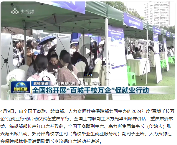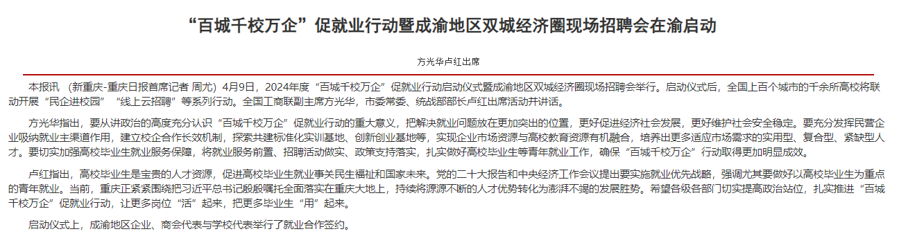 4月9日,2024年度“百城千校万企”促就业行动启动仪式暨成渝地区双城经济圈现场招聘会在我校举行。央视新闻、人民日报、重庆日报等主流媒体对此进行了报道。