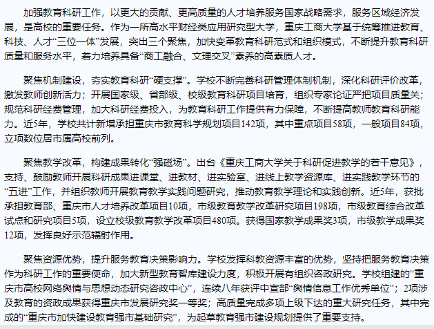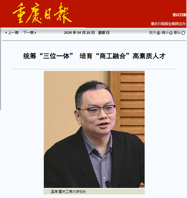 围绕“培养什么人、怎样培养人、为谁培养人”这一根本问题,我校坚定落实立德树人根本任务,锚定党和国家重大战略需求,统筹推进教育、科技、人才“三位一体”发展,加快变革教育科研范式和组织模式,不断提升教育科研质量和服务水平,着力培养具备“商工融合、文理交叉”素养的高素质人才。重庆日报以《统筹“三位一体” 培育“商工融合”高素质人才》为题,报道我校教育科研工作。