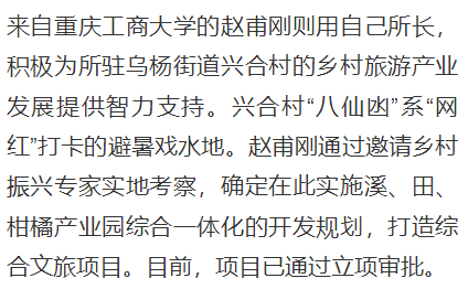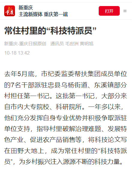 2023年5月,作为市纪委监委帮扶集团成员单位,我校选派赵甫刚、张杰、朱沙、陈琛四位中层干部到忠县担任第一驻村书记。一年多来,驻村干部充分发挥自身专业优势并积极争取派驻单位支持,指导村里破解治理难题、发展特色产业、促进农产品销售等,将科技论文写在田野大地上,成为常住村里的“科技特派员”,为乡村振兴注入源源不断的科技力量。近日,重庆日报新重庆客户端对此进行了报道。