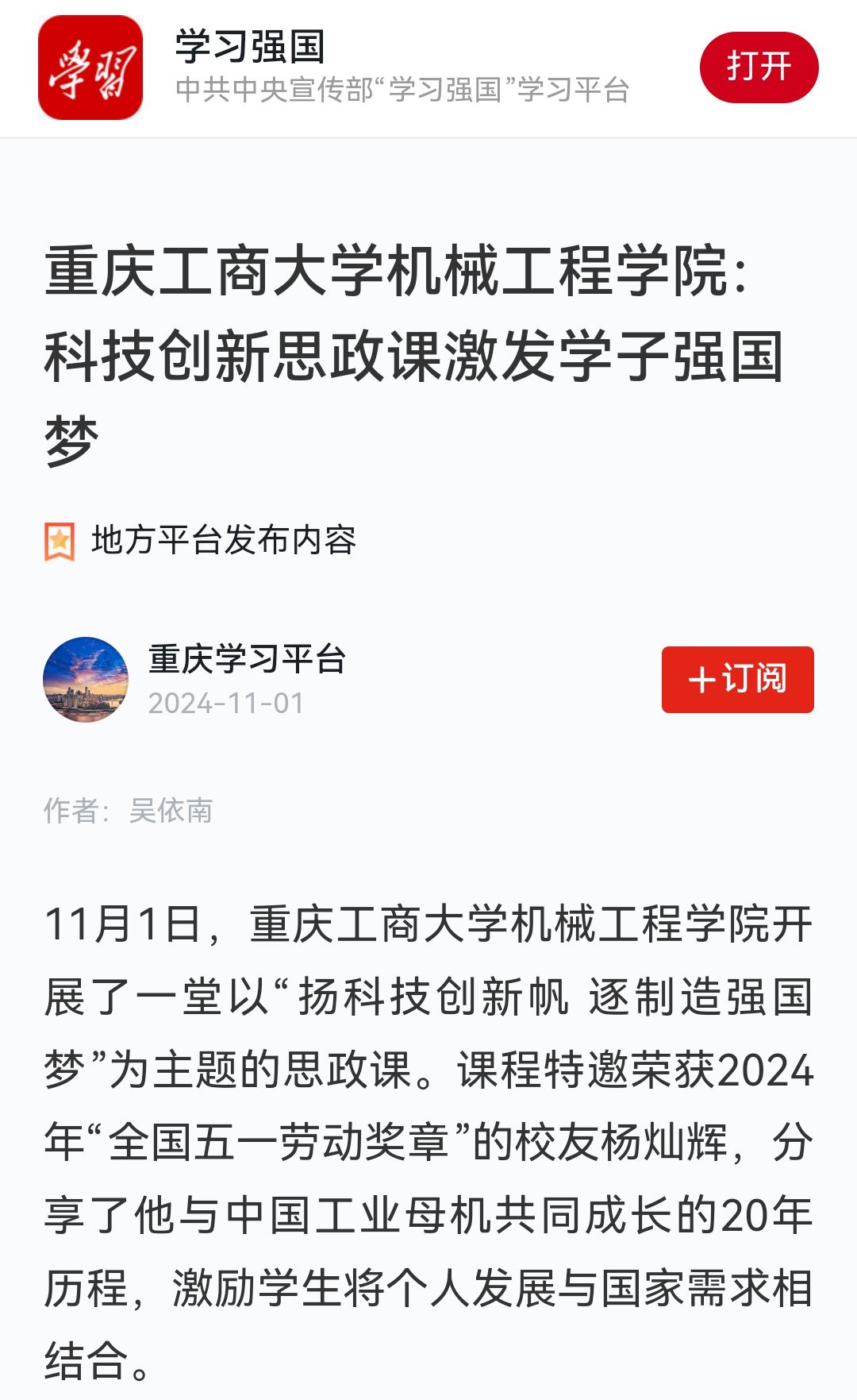 11月1日,机械工程学院开展了一堂以“扬科技创新帆 逐制造强国梦”为主题的思政课。课程特邀荣获2024年“全国五一劳动奖章”的校友杨灿辉,分享了他与中国工业母机共同成长的20年历程,激励学生将个人发展与国家需求相结合,在专业学习和实践中担负起强国建设使命。学习强国平台以《重庆工商大学机械工程学院:科技创新思政课激发学子强国梦》为题进行了报道。