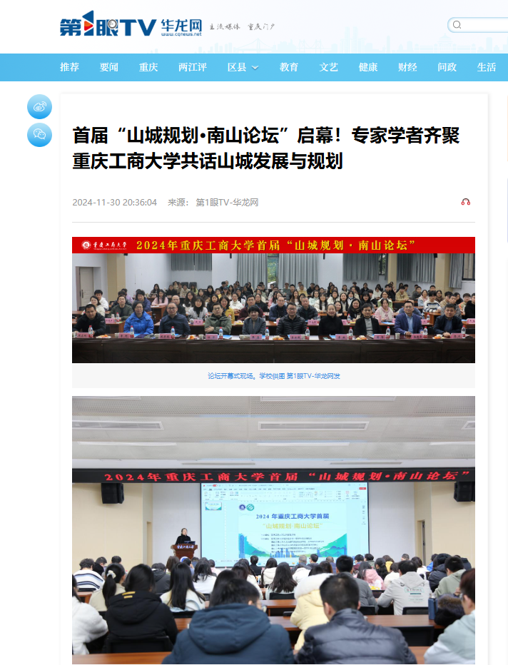 华龙网第1眼TV以《首届“山城规划·南山论坛”启幕!专家学者齐聚重庆工商大学共话山城发展与规划》为题,进行报道。
