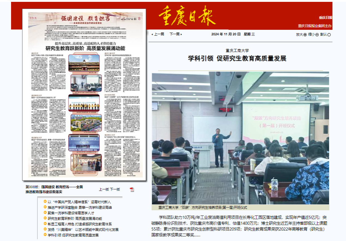 11月20日,重庆日报以“研究生教育跃新阶 高质量发展涌动能”为主题整版报道重庆市学位与研究生教育不断攀高向强,实现量质齐升。其中,以《学科引领 促研究生教育高质量发展》专题对我校学科建设与研究生教育成效进行了报道,对学校以“大商科+新工科”商工融合双轮驱动创新发展,构建了“1+2+2+4+N”学科发展局面,立足“商工融合”学科特色,“学科引领—改革创新—资源建设—三博三赛”四位一体的研究生教育发展思路及成效进行了详细介绍。