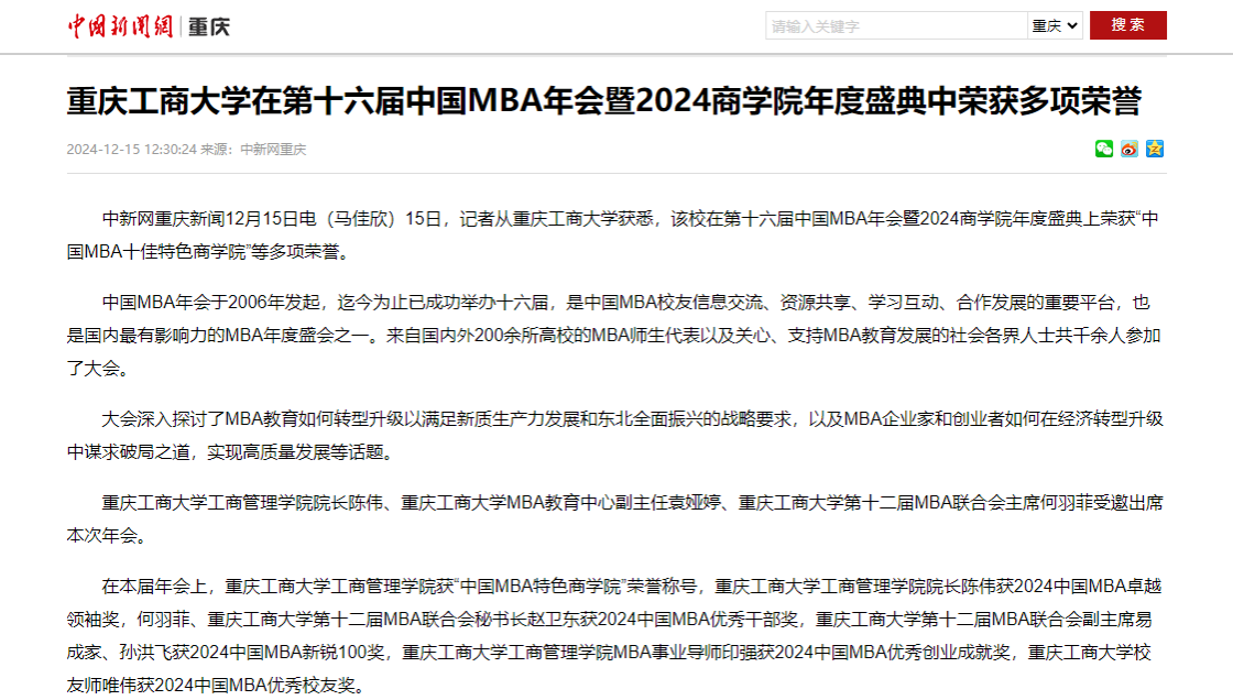 近日,中国新闻网以《重庆工商大学在第十六届中国MBA年会暨2024商学院年度盛典中荣获多项荣誉》为题,报道我校在由大连理工大学主办的“智驭新质 商启未来 共襄振兴”——第十六届中国MBA年会暨2024商学院年度盛典中荣获多项荣誉。