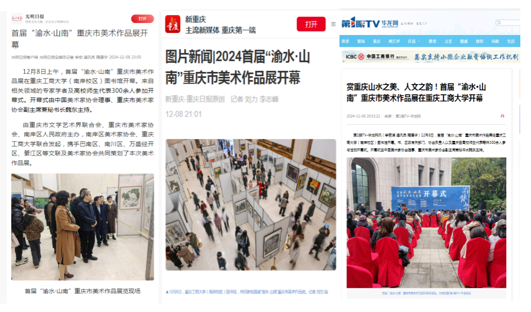 光明日报、重庆日报、华龙网等分别以《首届“渝水·山南”重庆市美术作品展开幕》《2024首届“渝水·山南”重庆市美术作品展开幕》《赏重庆山水之美、人文之韵!首届“渝水·山南”重庆市美术作品展在重庆工商大学开幕》为题,报道美术作品展。