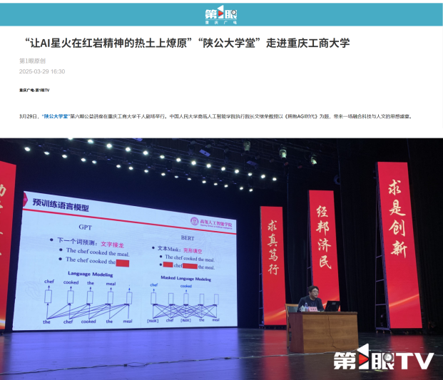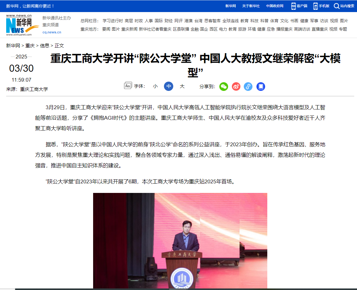 1、 新华网:《重庆工商大学开讲“陕公大学堂” 中国人大教授文继荣解密“大模型”》
