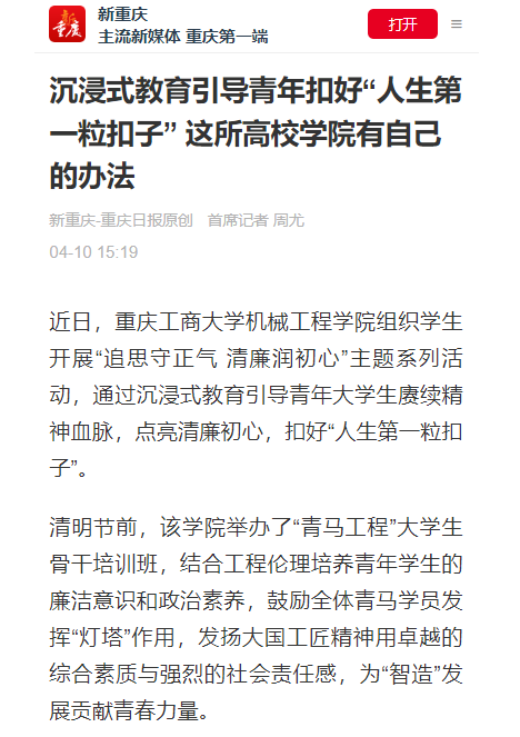 2025年清明节前后,机械工程学院组织学生开展“追思守正气清廉润初心”主题系列活动。通过沉浸式教育引导青年大学生赓续精神血脉,点亮清廉初心,扣好人生第一粒扣子。新重庆-重庆日报以《沉浸式教育引导青年扣好“人生第一粒扣子” 这所高校学院有自己的办法》报道该活动。
